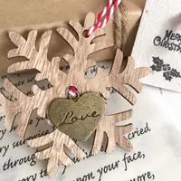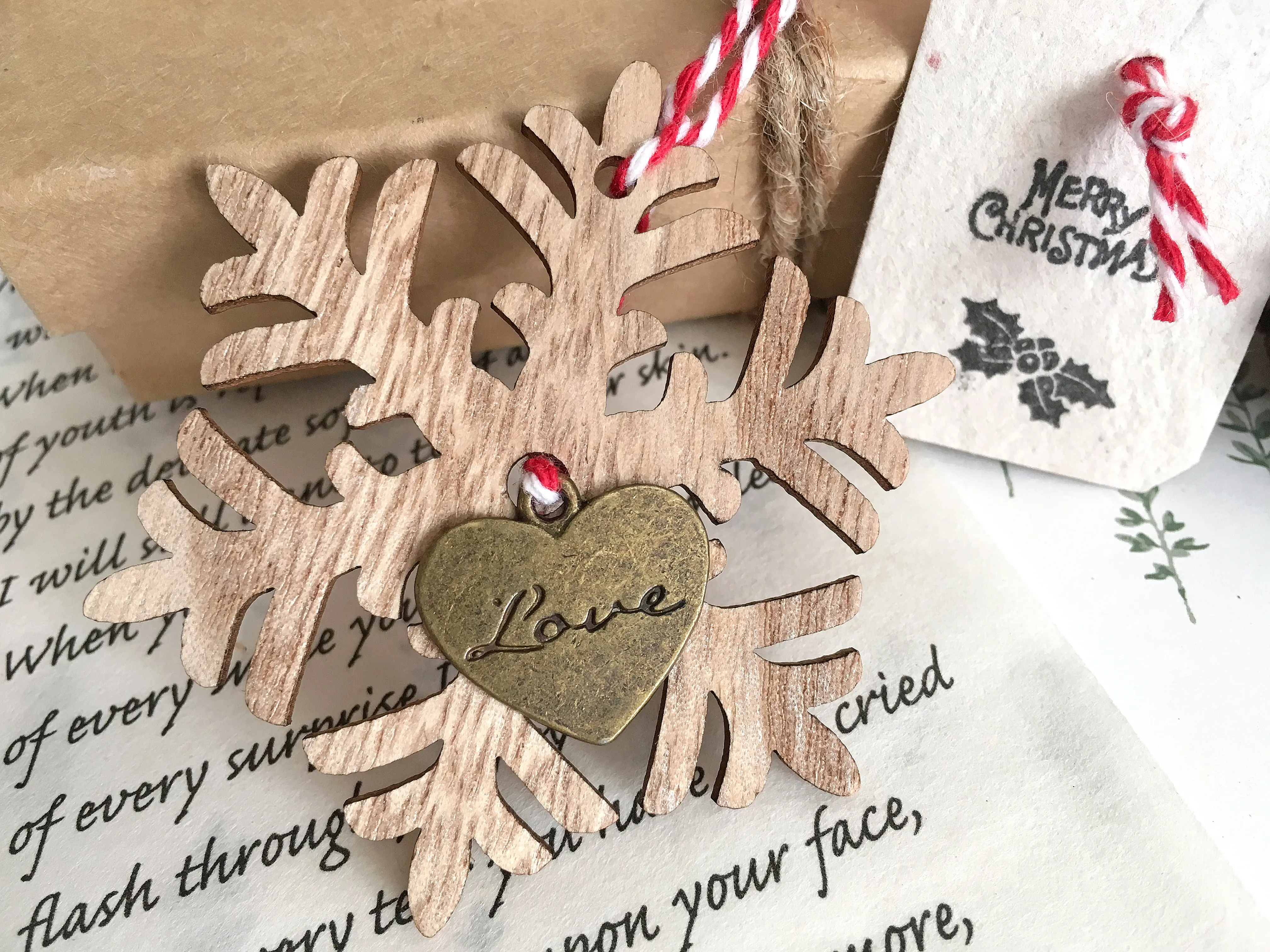 Wooden snowflake with a metal alloy heart - Xmas Ornament