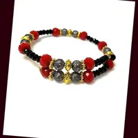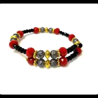 This dark gray glitter textured bracelet features faceted black rondelles, red rondelles and gold spacers.