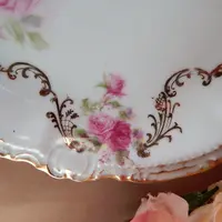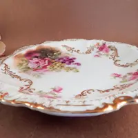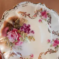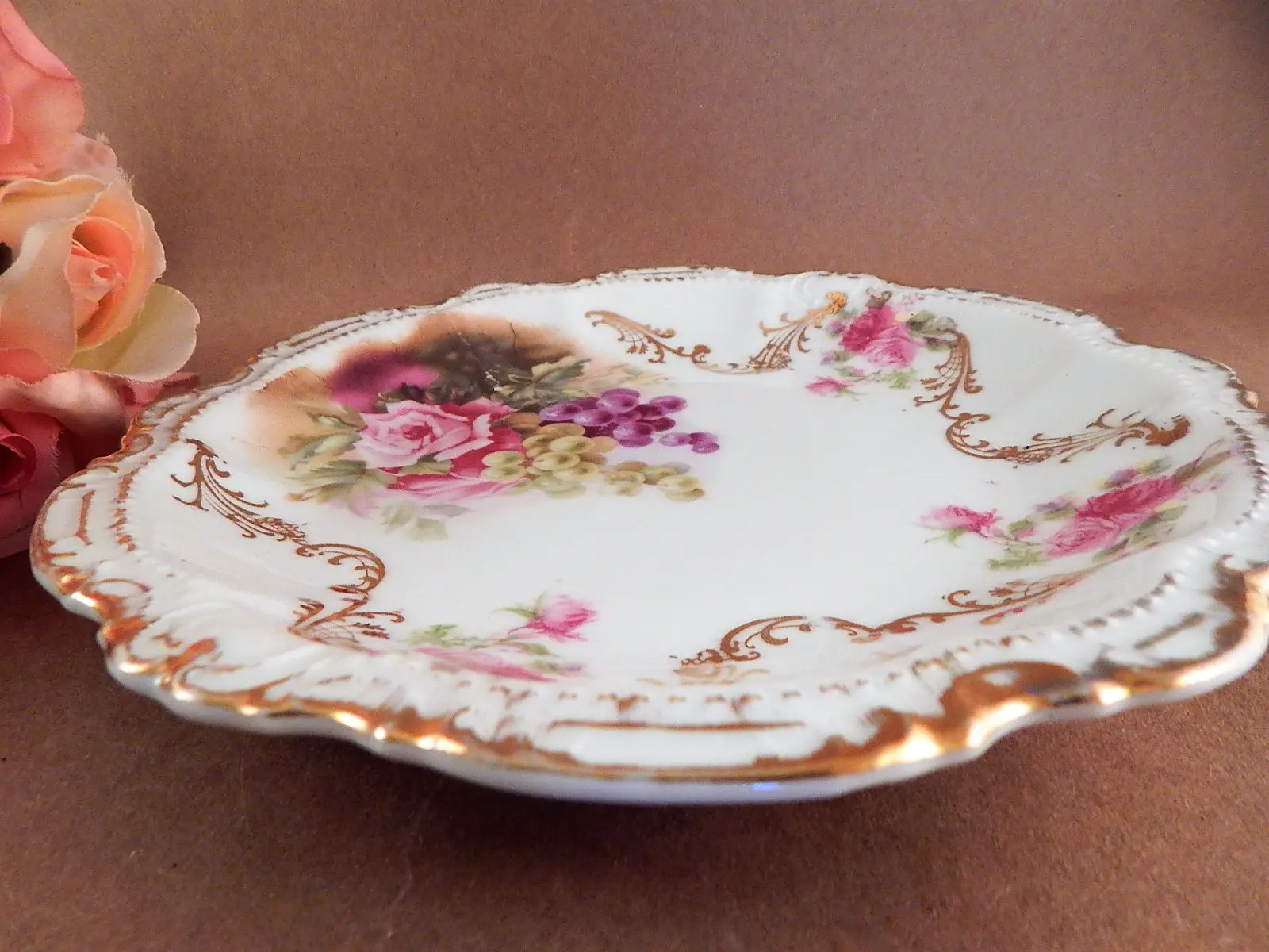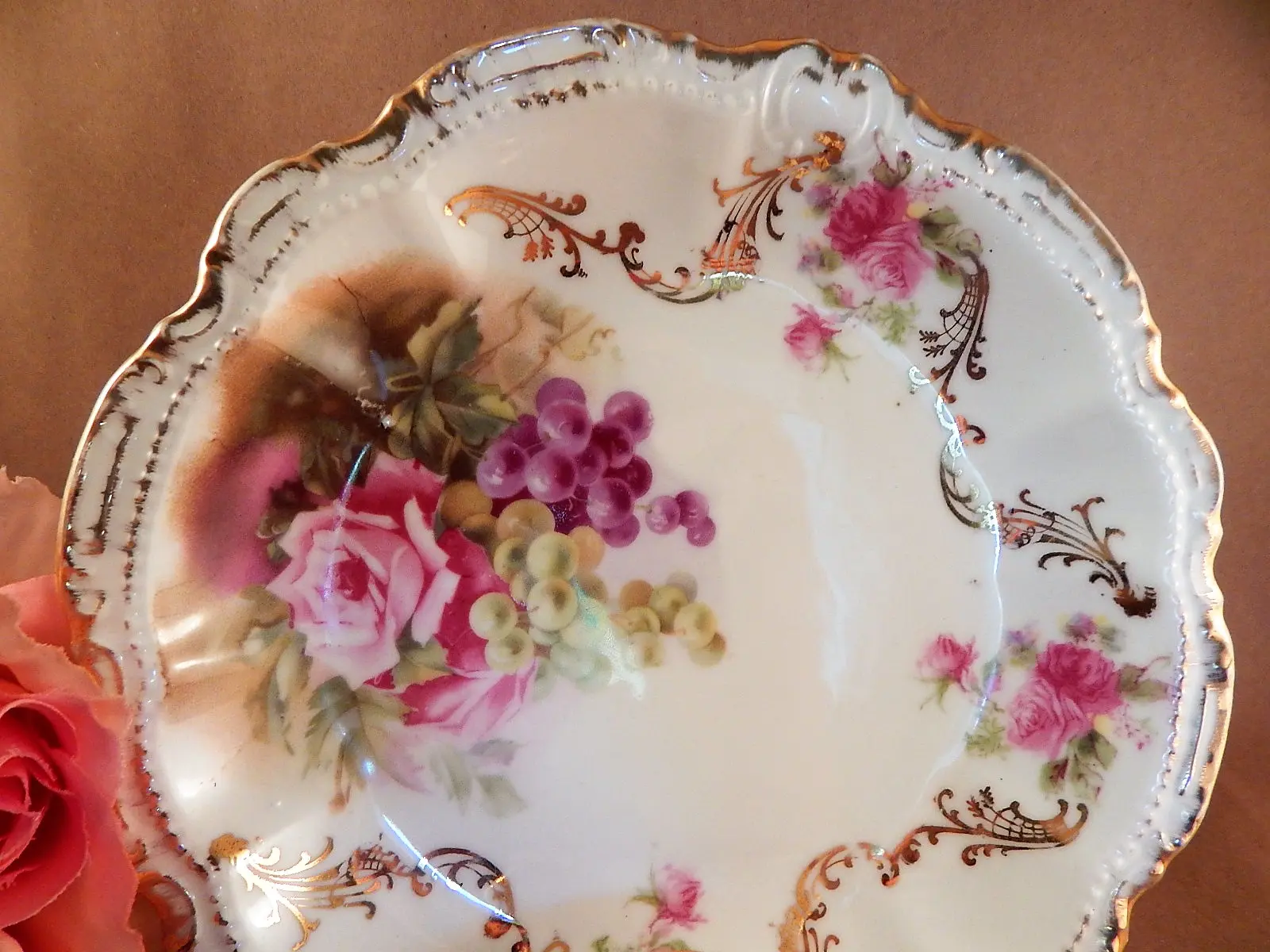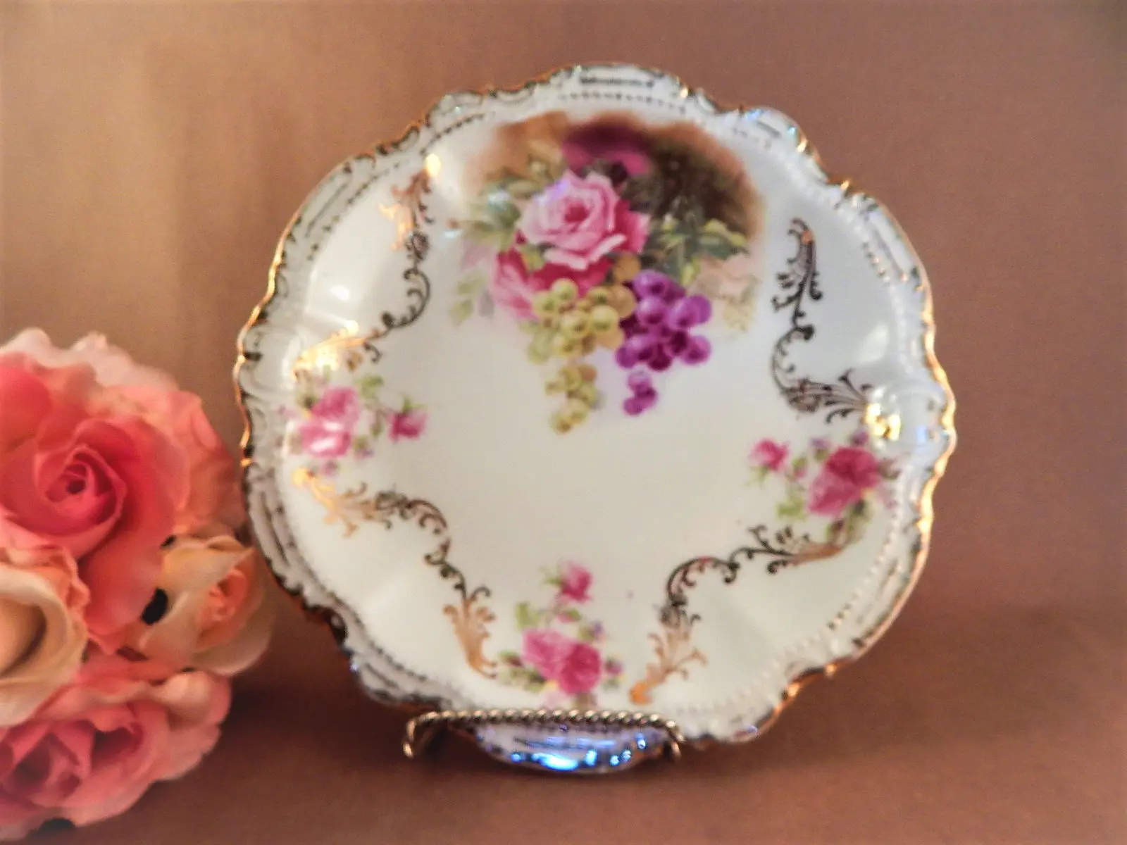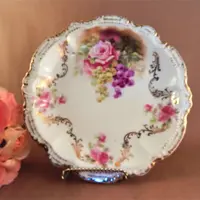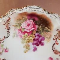 vintage, antique, plate. bowl. dish, porcelain, moschendorf, bavaria, bavarian pottery, german, pink rose, grapes, art nouveau, collectible, pottery