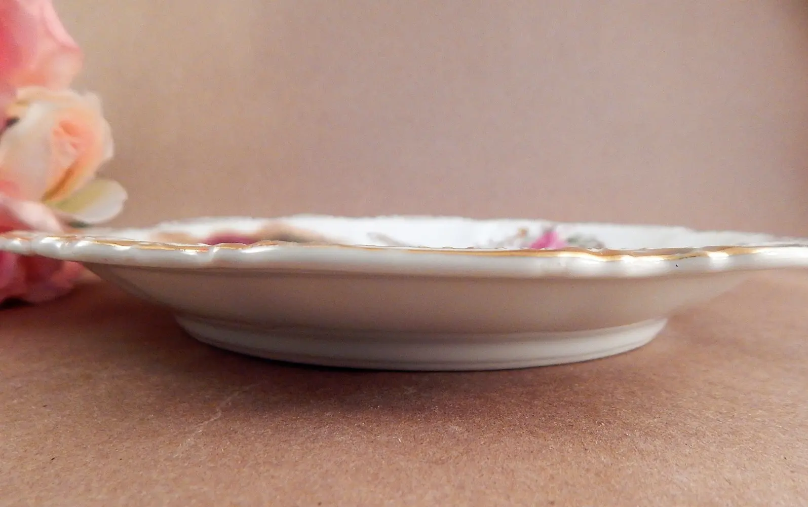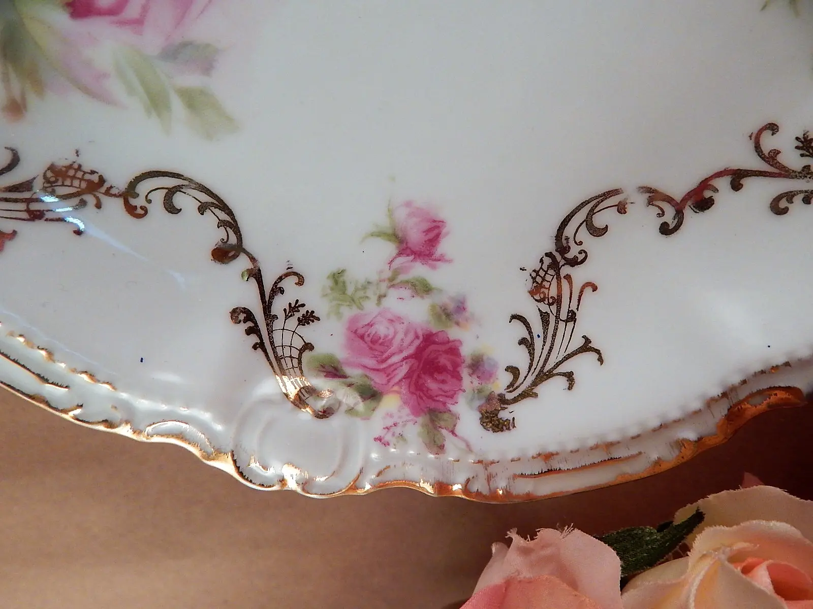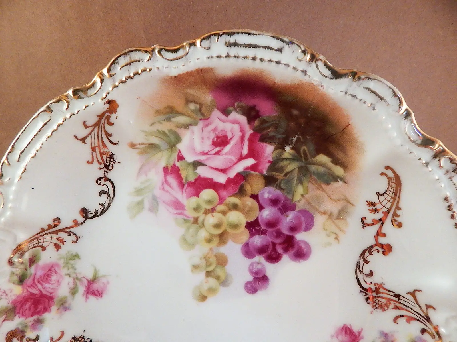 Very good condition for age with some light gilt wear and light paint wear on right side on the large rose, above the grape leaves.