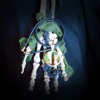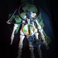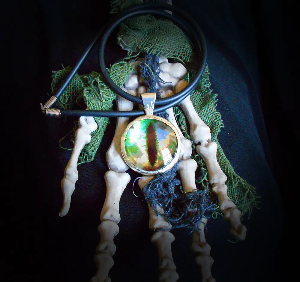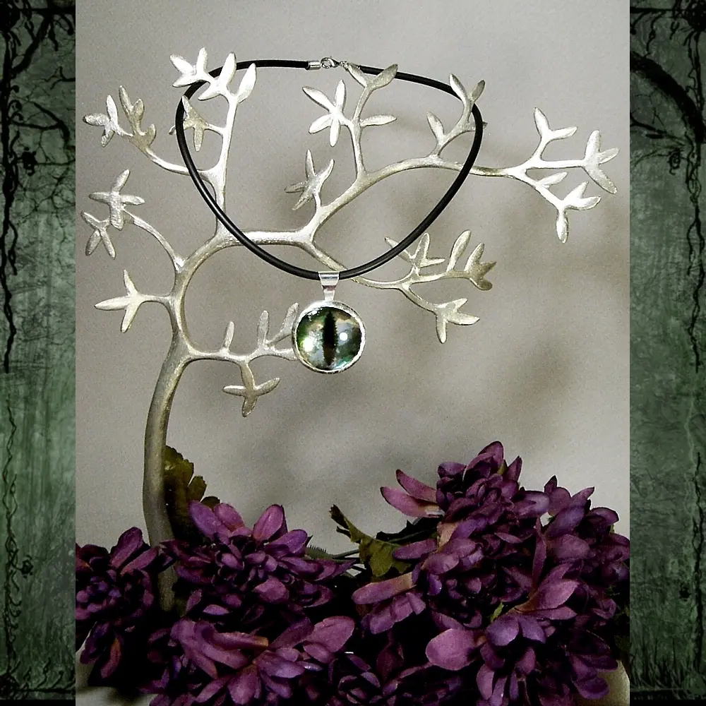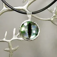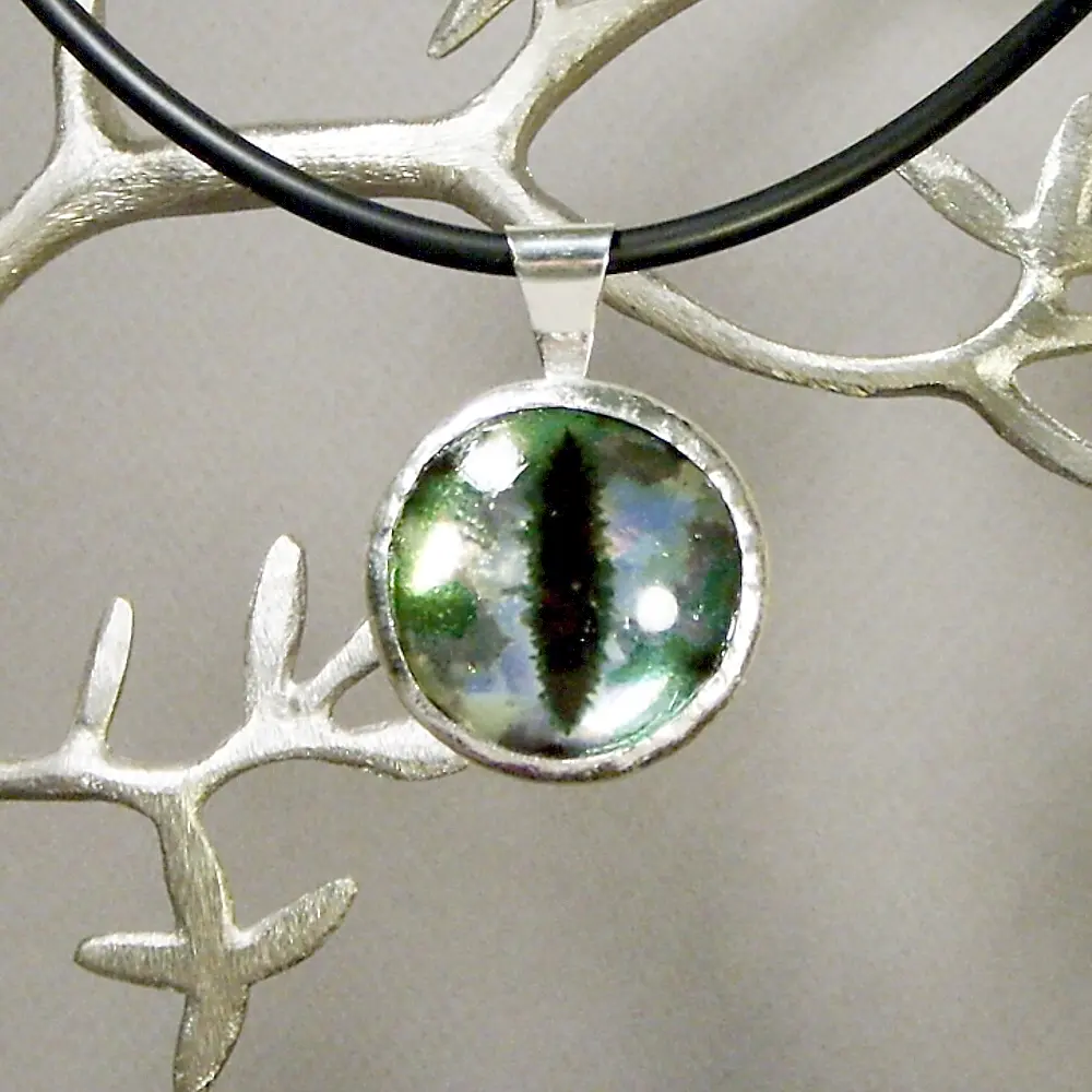 Something special to wear this Halloween season! Actually, you can wear this ANY TIME! You can carry with you the power, and wonder of the Dragon throughout the world. OOAK Hand-cast, poly-resin Metallic Dragon eye on an 18" Hypoallergenic black rubber cord The eye is set in a sterling silver, hand hammered and burnished bezel. You can allow it to tarnish, and blacken if you wish, or... keep it polished like shiny new, it is up to you! Either way, it will remain stunning! The measurements of the pendant is 1.5" wide, and 2" long Including bail, the pendant is approx 1/4" thick at highest dome This pendant is unisex so it can be worn by anyone; Man, Woman, Child... Beast, Ghoul, or Demon!
