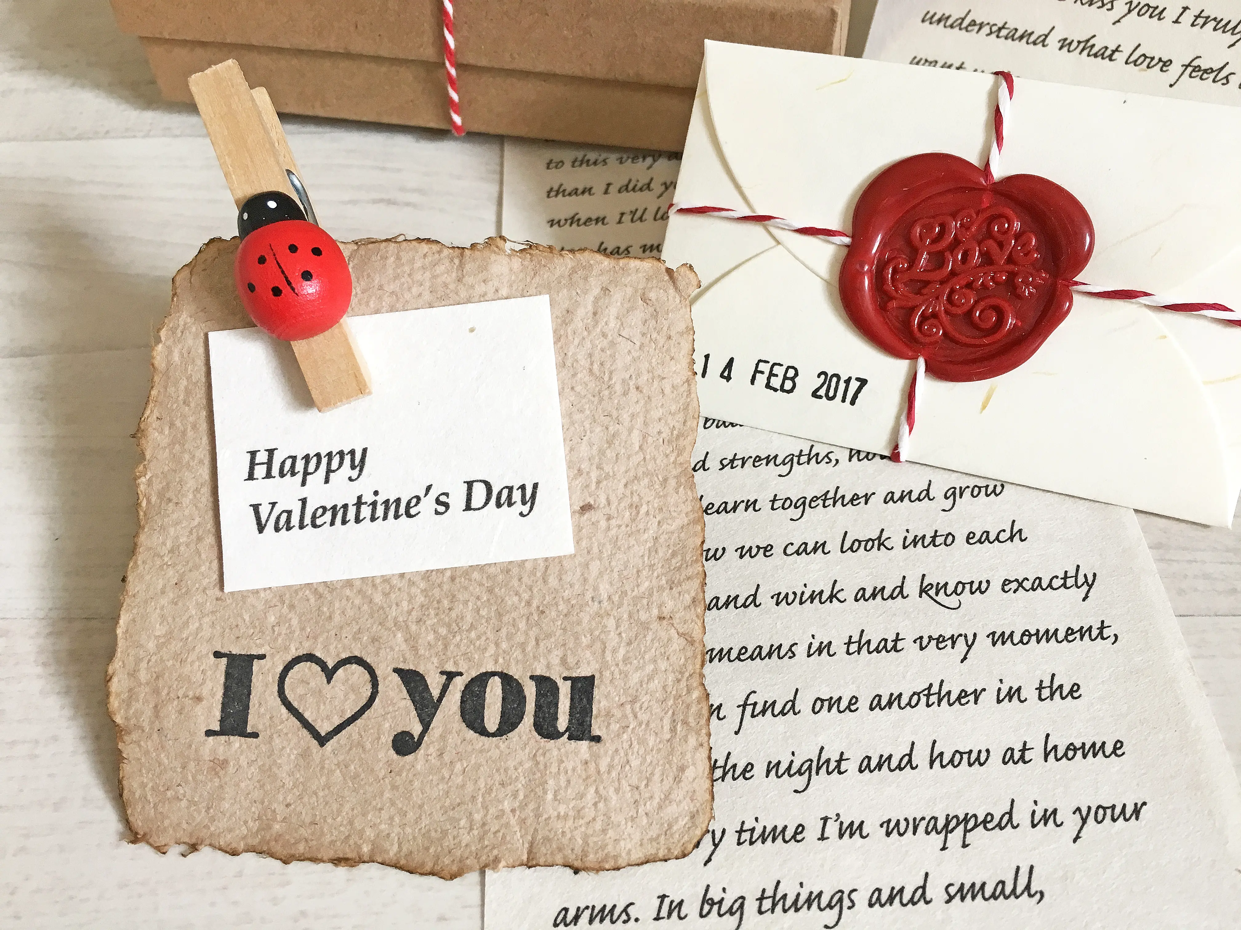 Handmade paper card, a wooden peg decorated with a wooden Ladybug