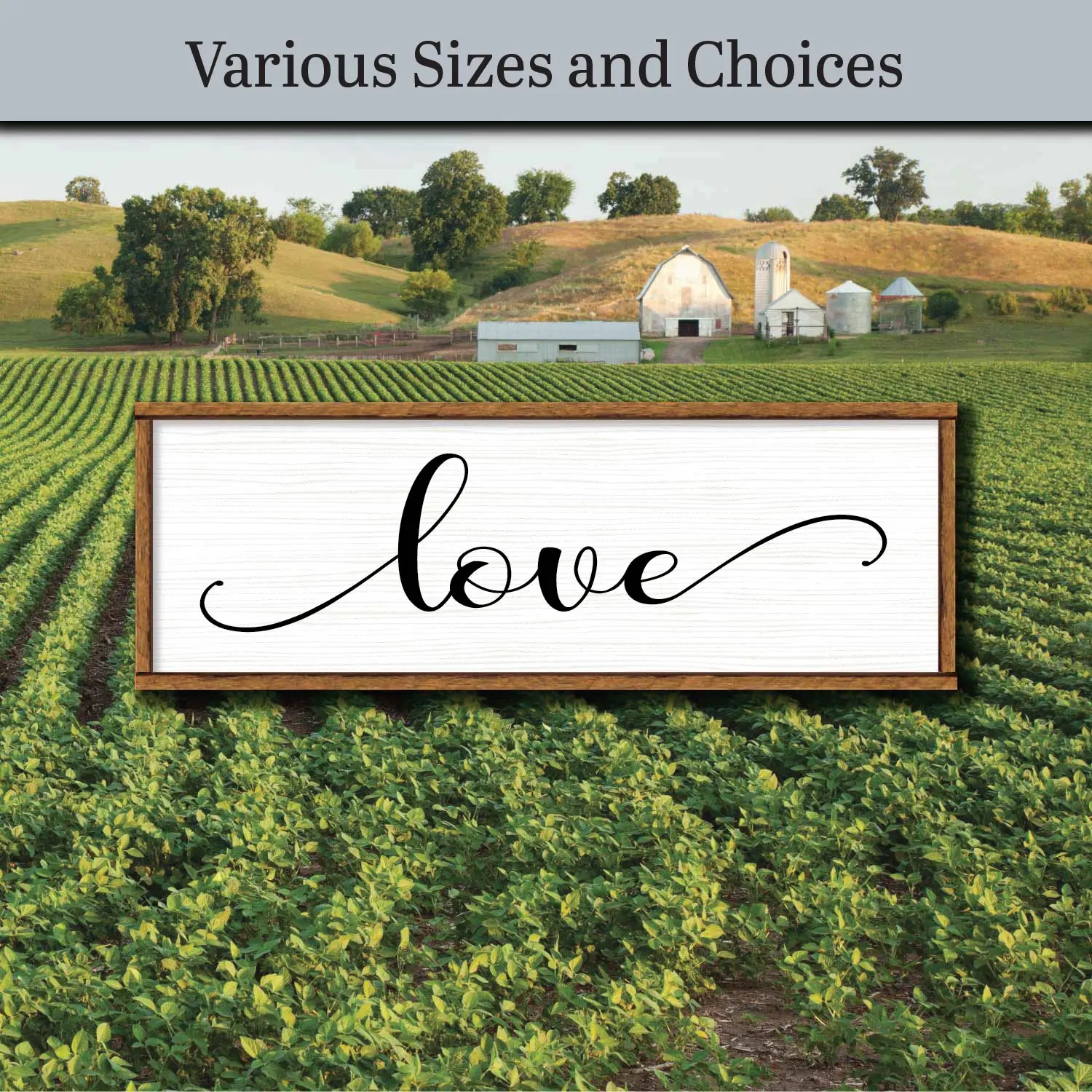 "Love will be inscribed on this beautiful farmhouse decor sign. Farmhouse Plaques is a husband-wife company designing artistic words and creating precision cut vinyl lettering to display the inscription you have chosen. You can expect the sign lettering to look exactly as shown in the image. Modern calligraphy plaques will help you bring rustic farmhouse signs to your home decorations with vintage look wall art. Our signs display a welcoming country home decor, and this trendy wall hanging will beautifully decorate your home with old-fashioned farm charm.