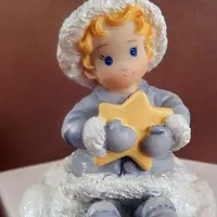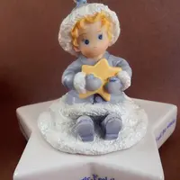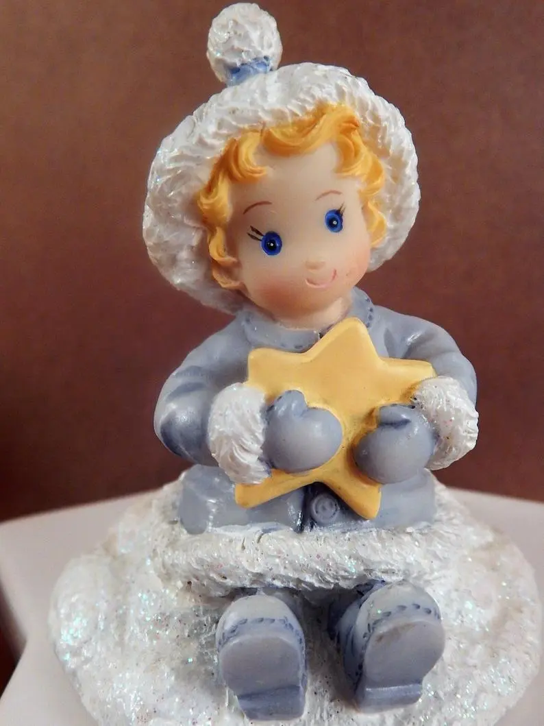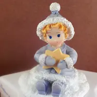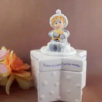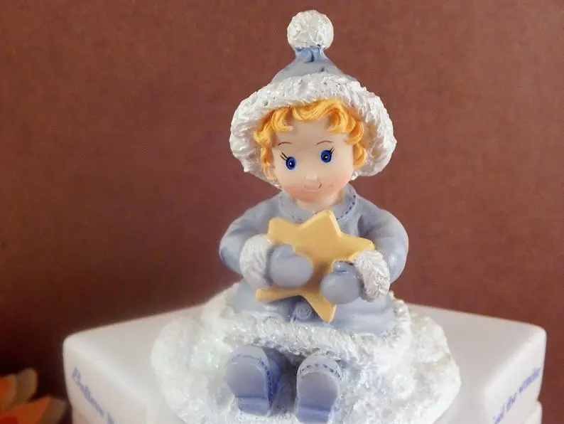 vintage home decor, figurine, girl blond child, snow girl, winter decor, blue and white, hmk, hallmark, houston harvest, gift product, trinket dish, gift box, jewelry box, candy dish, christmas decoration