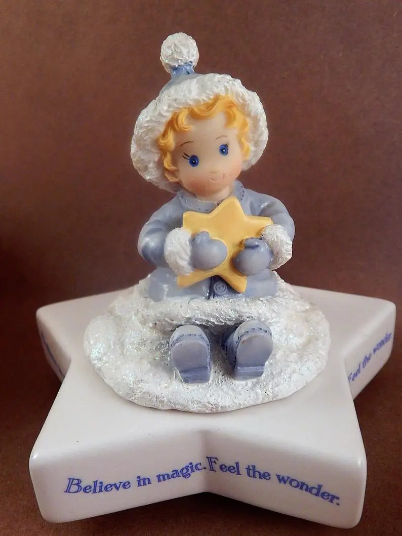 A figurine depicting a blond girl wearing blue and white winter clothes holds a star on top of the box on which it is written "Believe in Magic. Feel the Wonder."