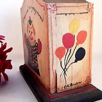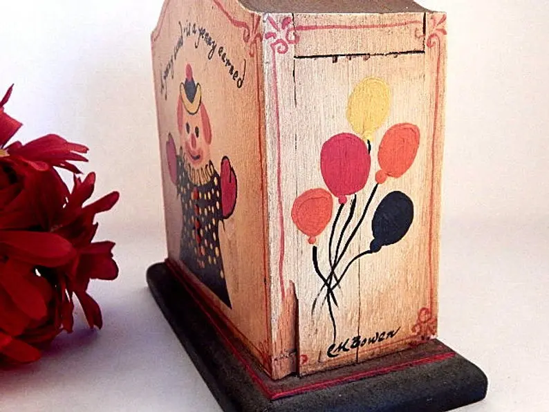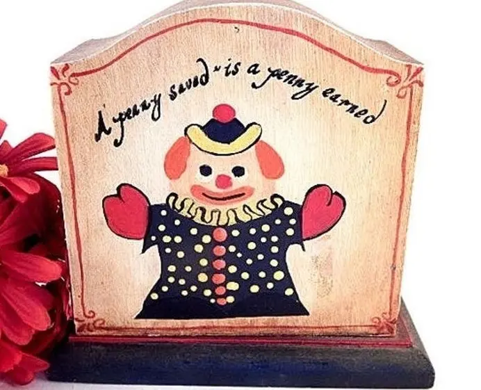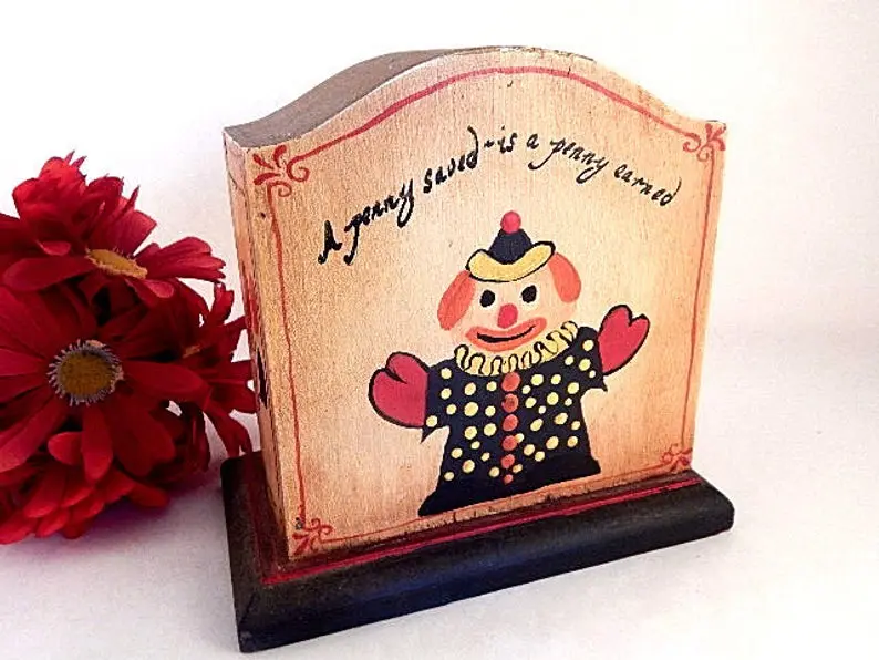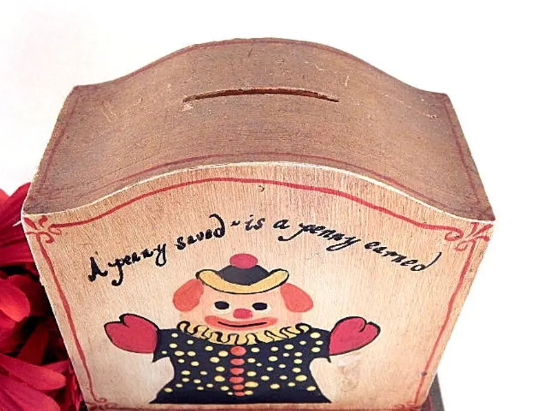vintage, bank, piggy bank, coin bank, childrens bank, wooden bank, clown, antique, coin box, a penny saved
