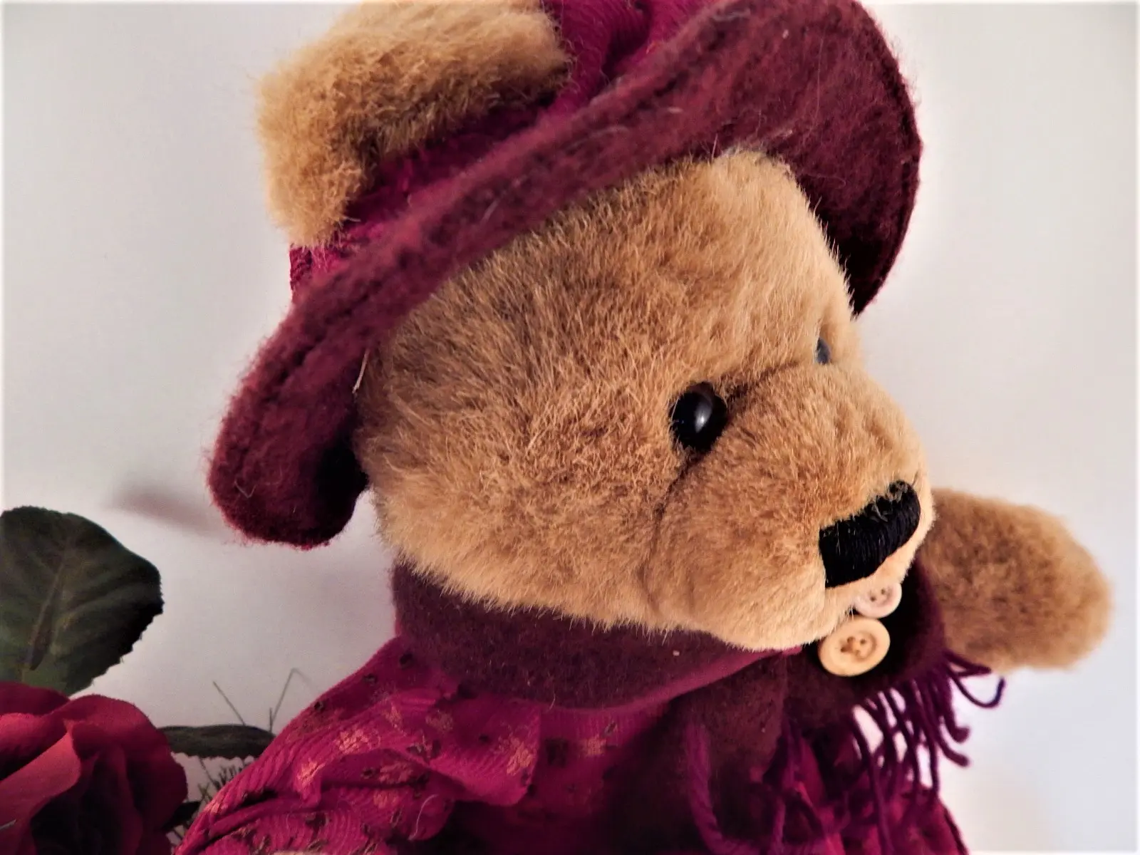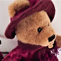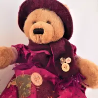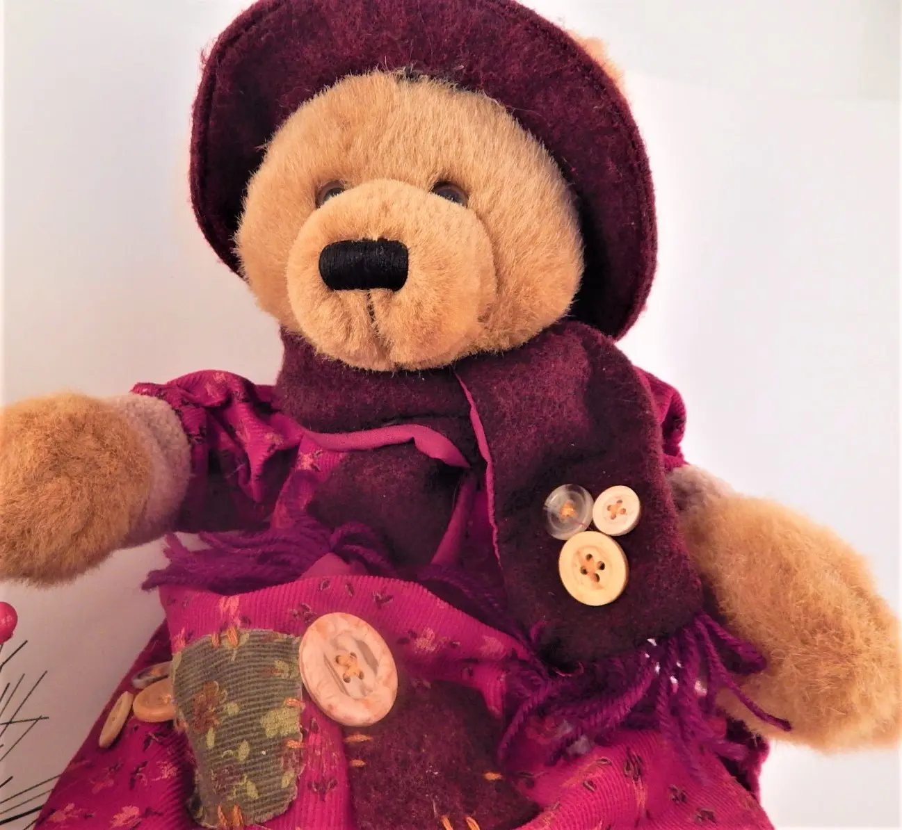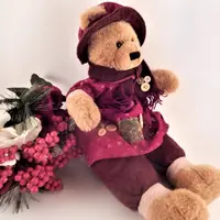 Bear wearing burgundy (dark red) winter attire embellished with fabric patches and buttons