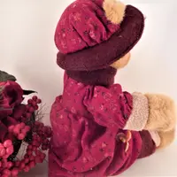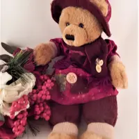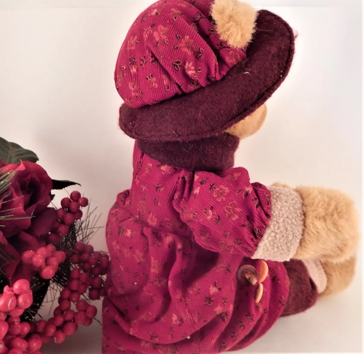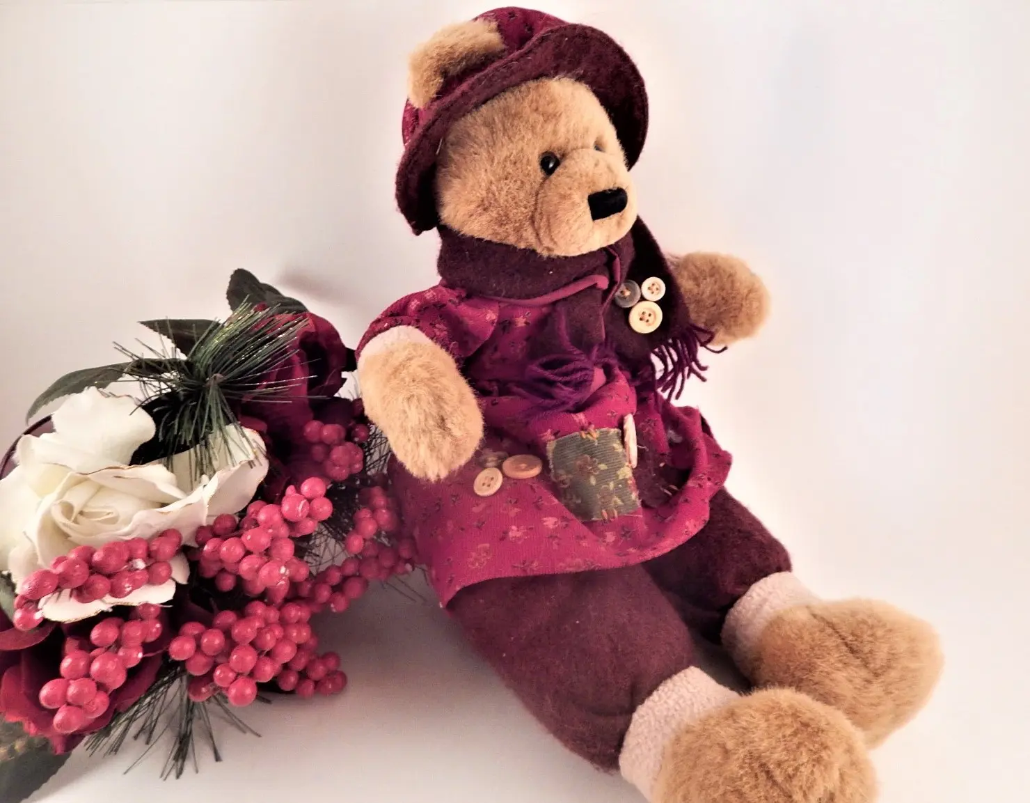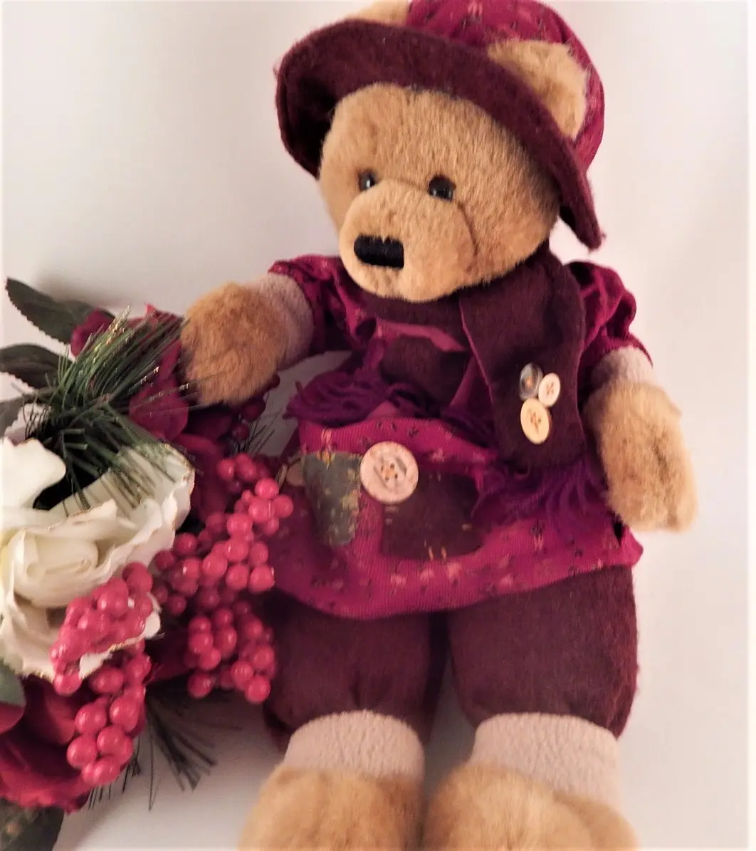 bear, stuffed animal, girl bear, winter bear, beige bear, burgundy , red, christmas, home decor bear, vintage bear,
