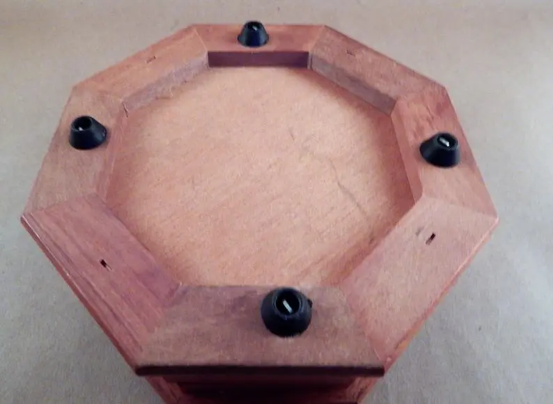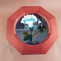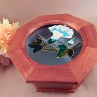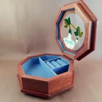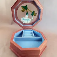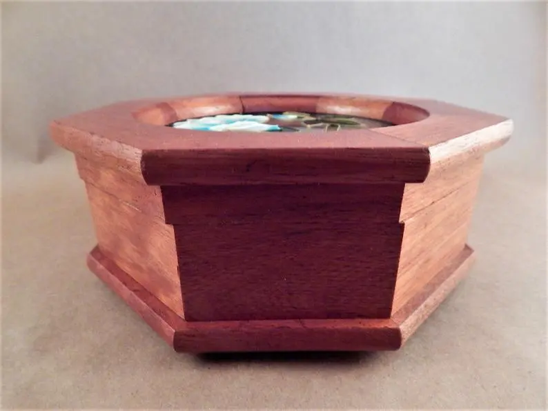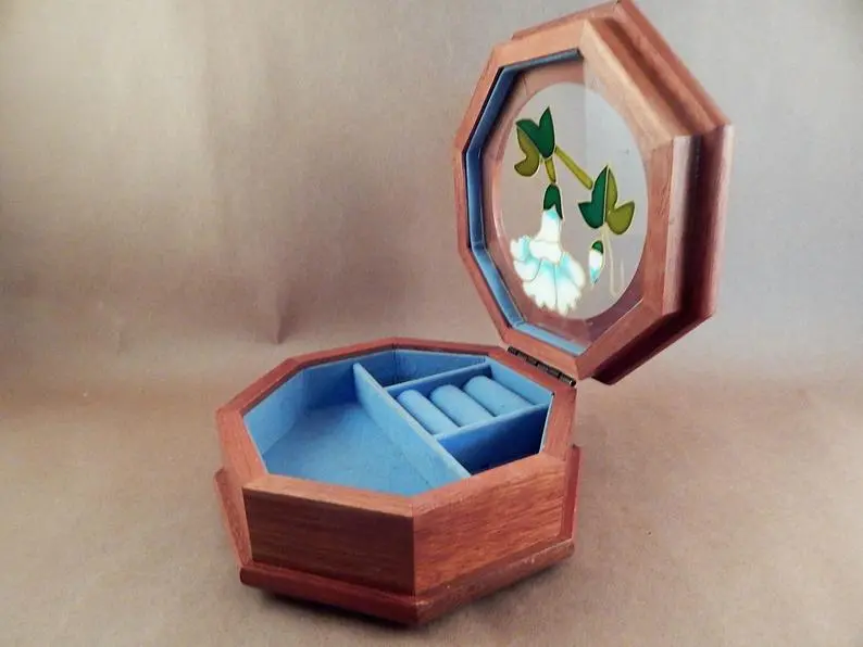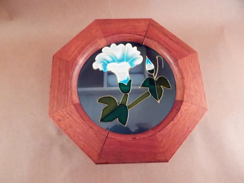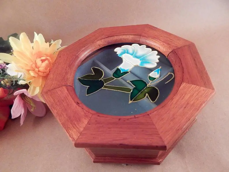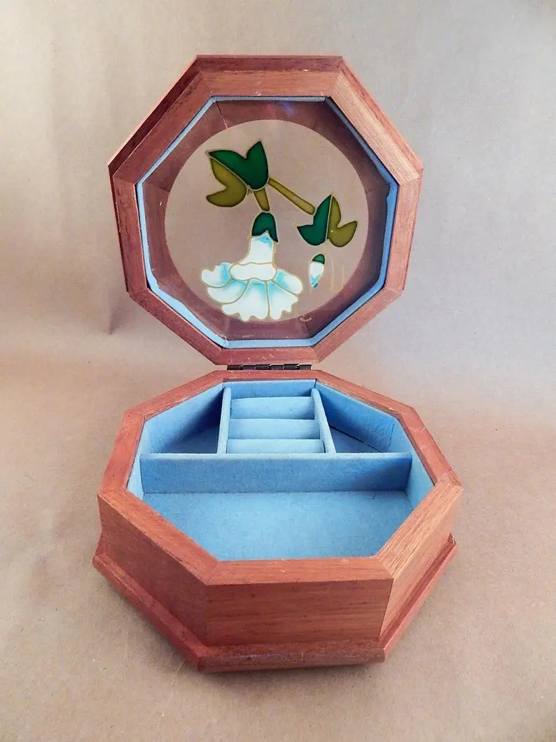 Covered Jewelry Box 8 Sided Blue Floral Painted Glass Top Wooden Compartment Case Trinket Keepsake Organizer Vintage 1980s