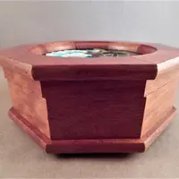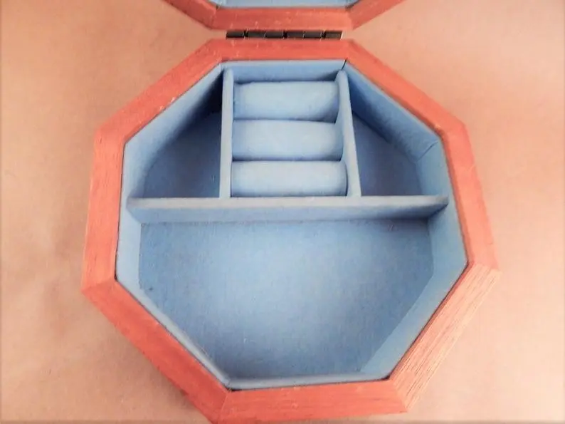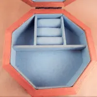 vintage, box, storage, womens, jewelry box, compartment,ring box, covered box,vanity table box, dresser top, wooden box, blue, floral, octagon box