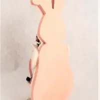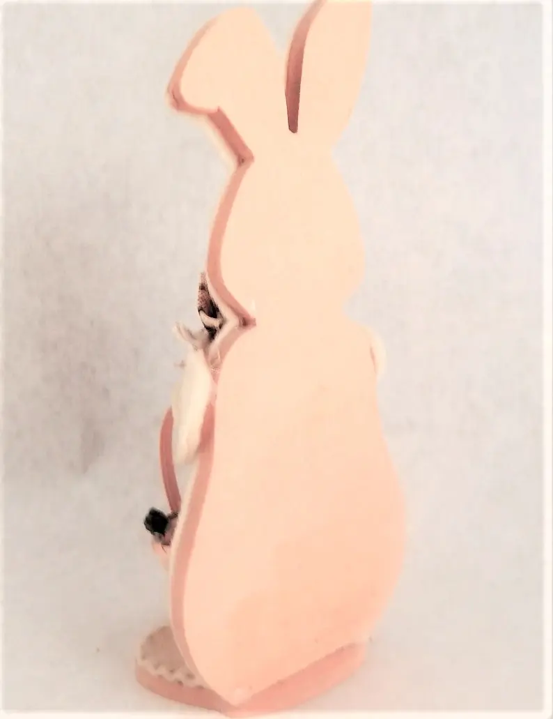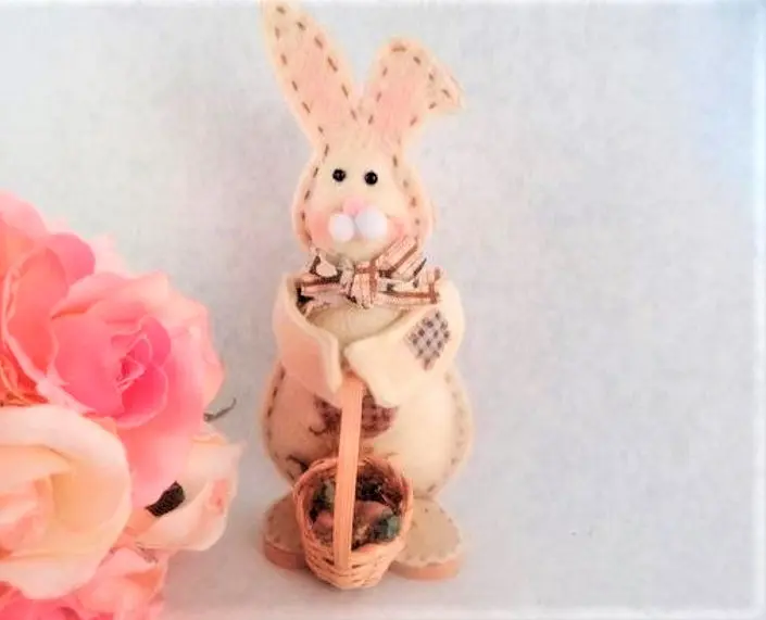 Easter Bunny Figurine Wood and Fleece White Rabbit Wicker Carrot Basket Folk Art