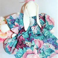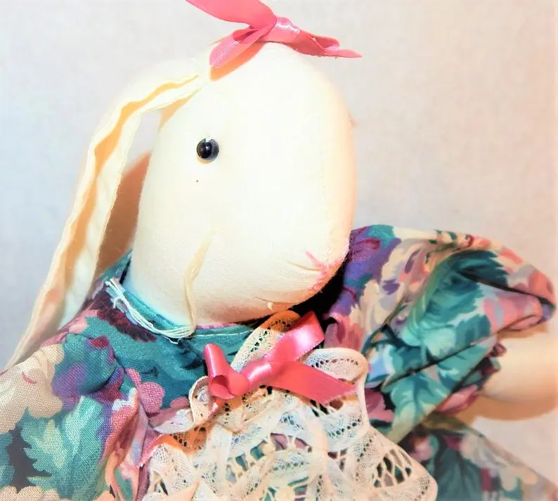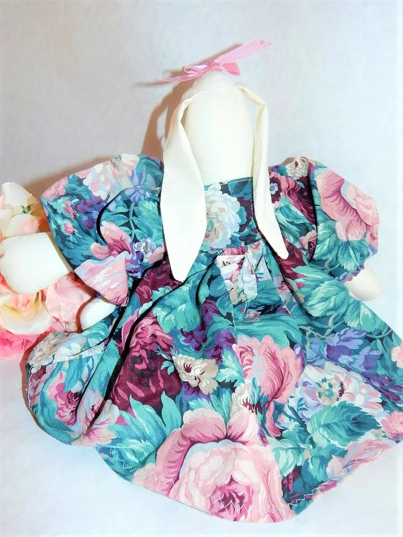 Charming white bunny rabbit stuffed animal dressed for a garden party, Spring tea, or Easter celebration