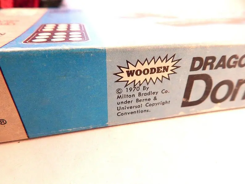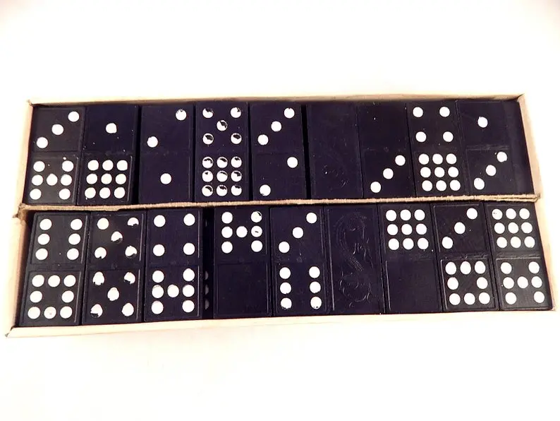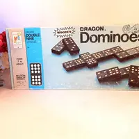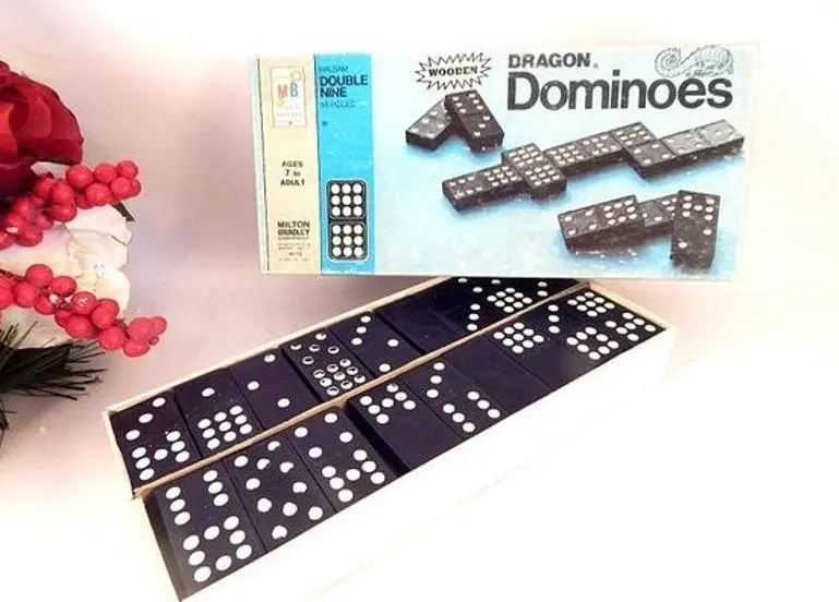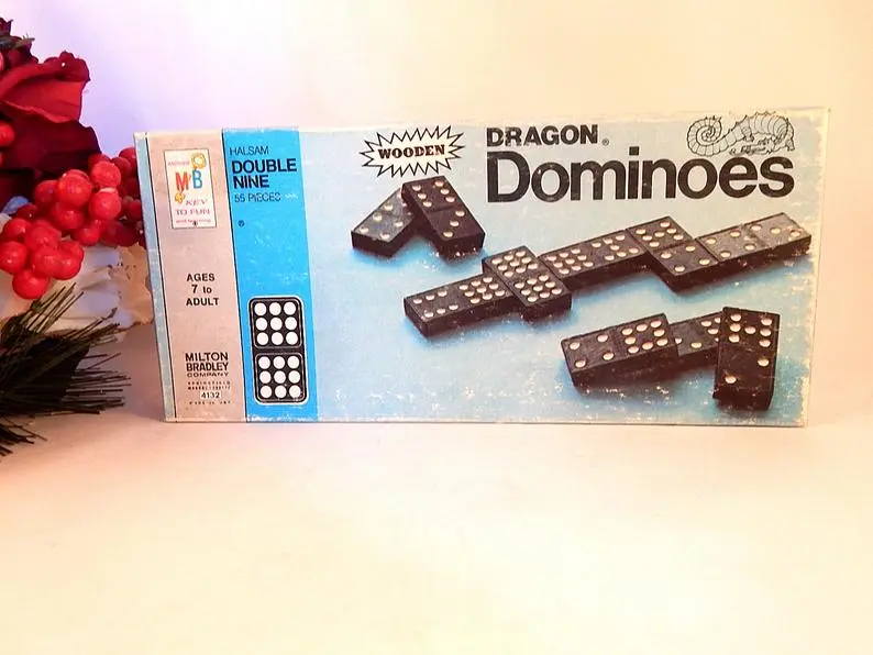 vintage, toy, game, dominoes, domino game, family game night, bar game, travel game, milton bradley, halsam, double nine 55 piece, wooded dominoes, dragon dominoes, retro 1970s