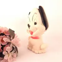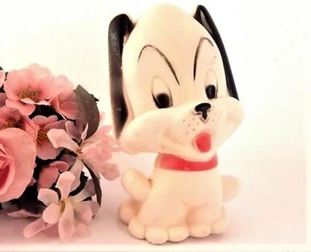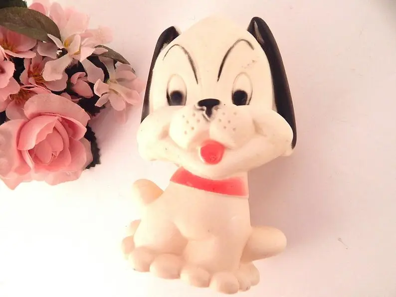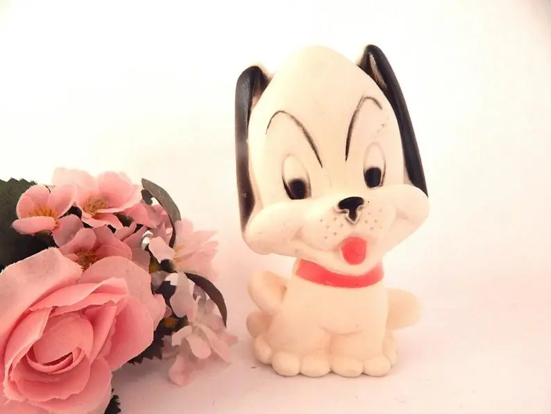 vintage toy, squeak toy, rubber toy,dog puppy, white and black, long ear dog, baby toddler toy, girls room decor, baby joy toy, 1960's collectible, toy animal dog, rubber squeak toy,