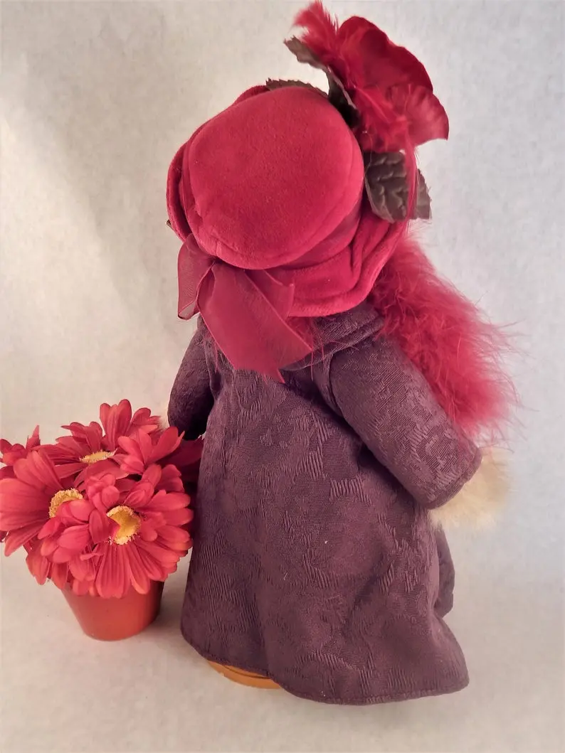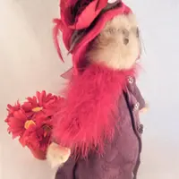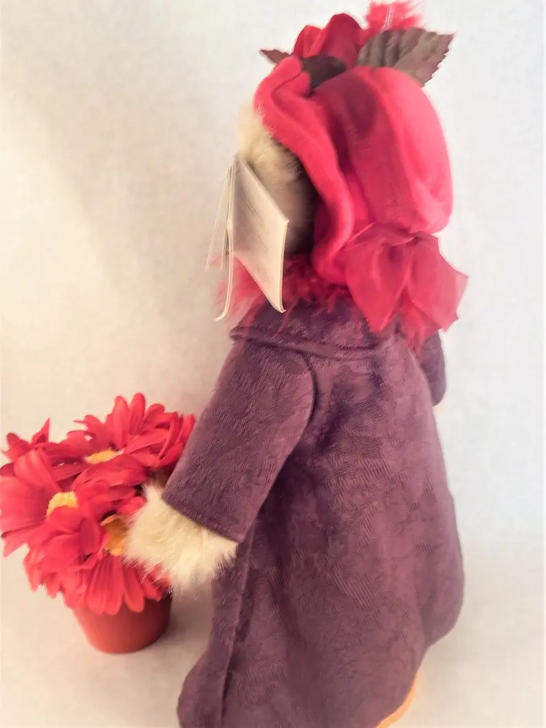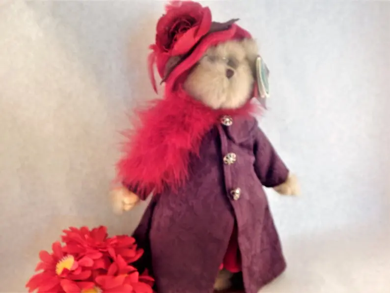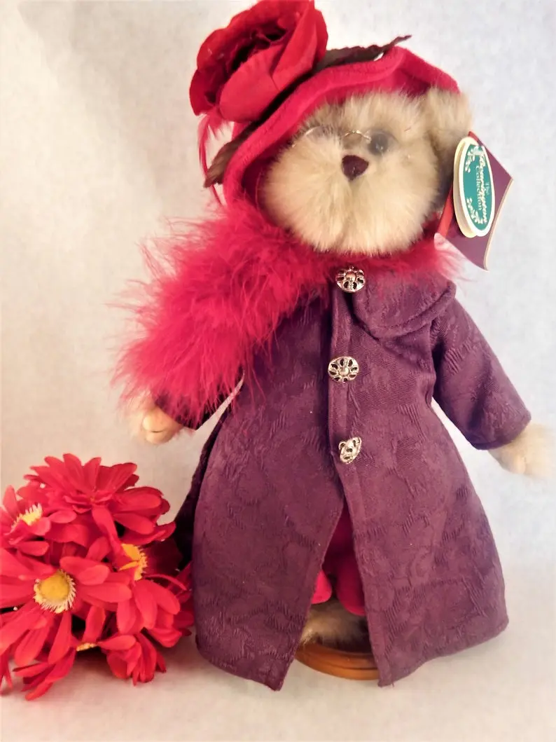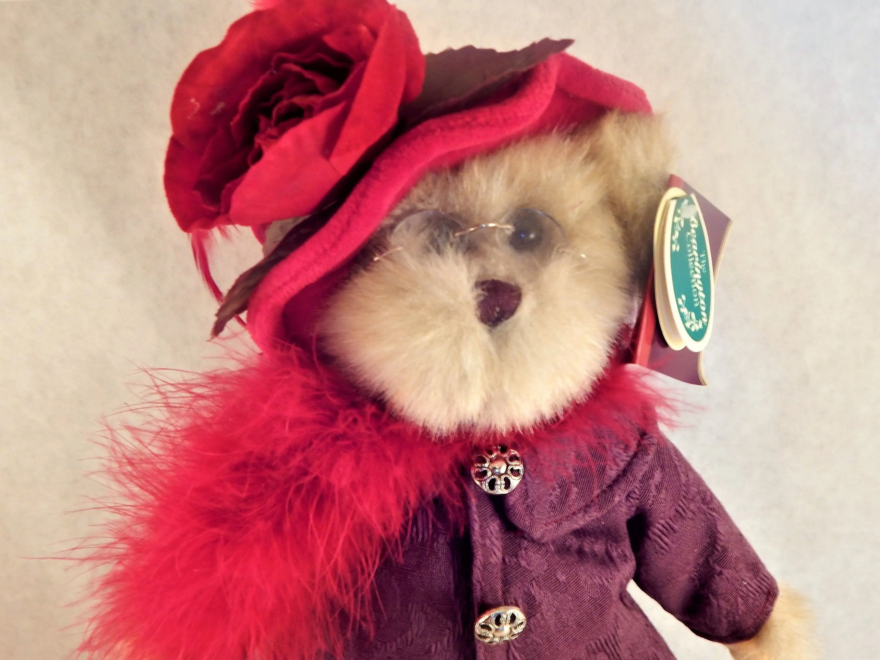 bear, bearington, queen fedora, red, purple, hat, coat, party decoration, luncheon decor, social bear, tea party bear, stuffed animal, mascot, party decoration, meeting door prize, gift bear