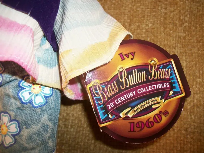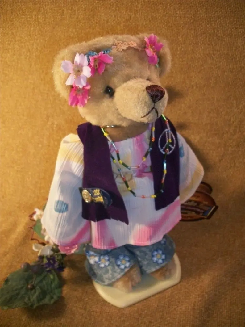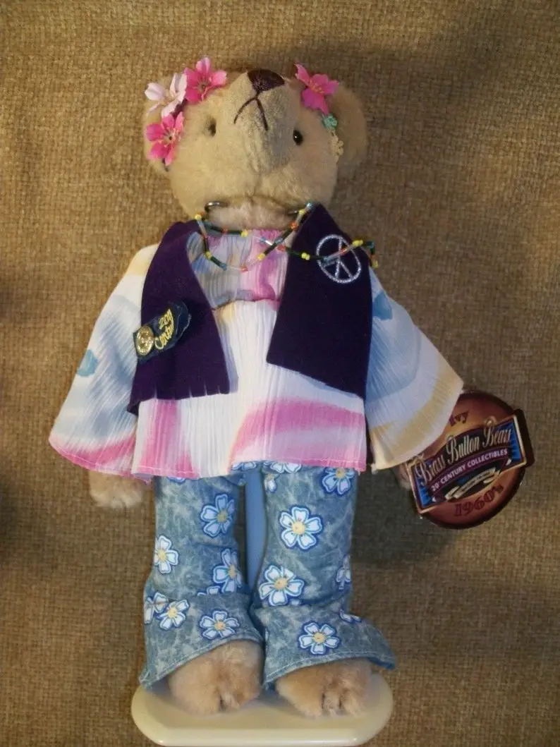 Bear Plush Stuffed Animal 1960s Summer of Love Hippie Flower Child Named Ivy Brass Bear Collectible Vintage 1999