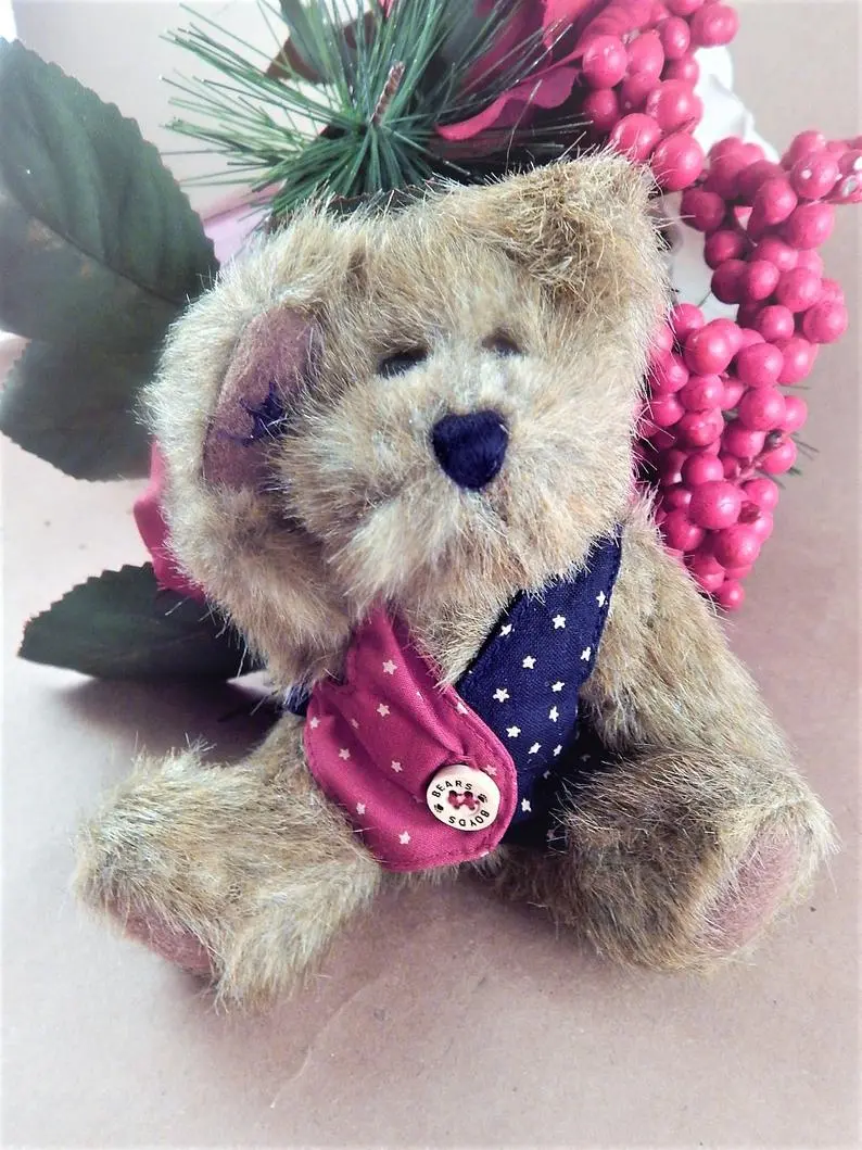 toy, stuffed animal, teddy bear, patriotic bear, boyds bear, collectors edition, boy bear, patriotic bear, americana, salutiing bear, 6 Inch bear, collectible, christmas in july, brown bear, jointed bear, vintage, stocking stuffer,