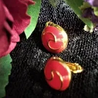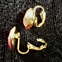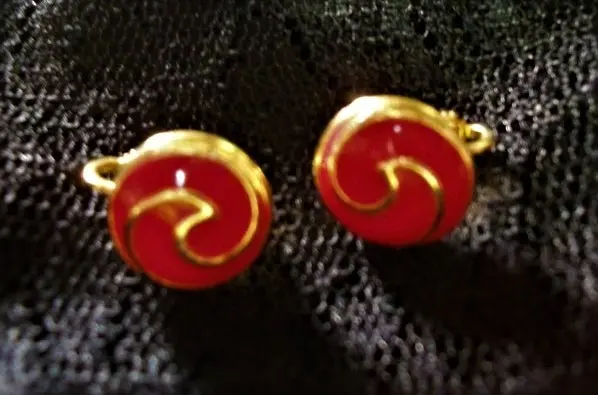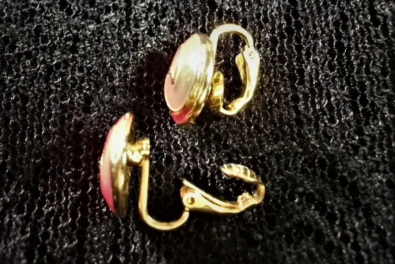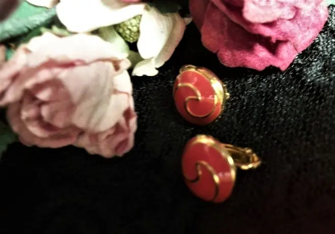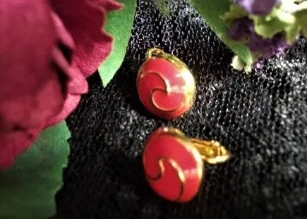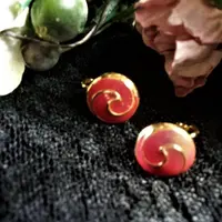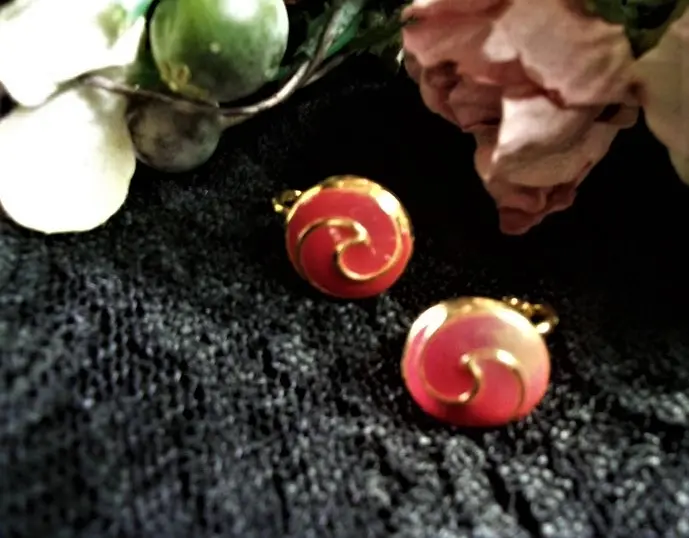 vintage jewelry, earrings, clip on, peach, pink ,coral, gold, round dot circle, mod jewelry, elegant classic, spring fashion. ying yang,
