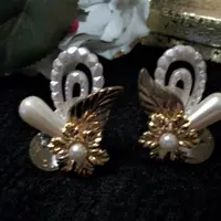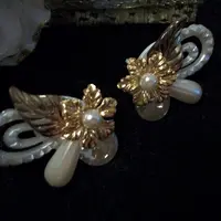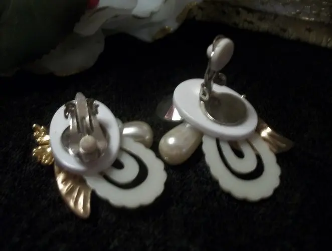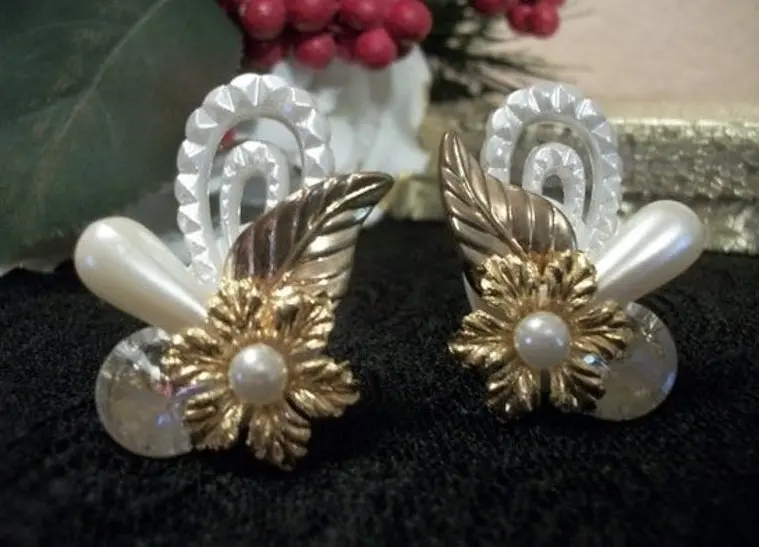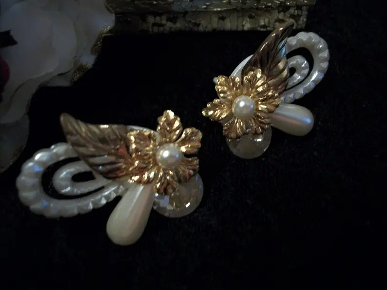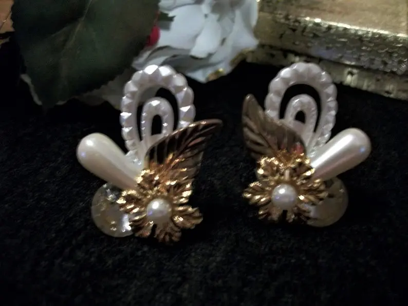 Earrings Clip On White Pearl Beads Gold Floral Ornate Artistic Modern Cluster Wedding Bridal Vintage Costume Jewelry Fashion Accessory