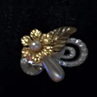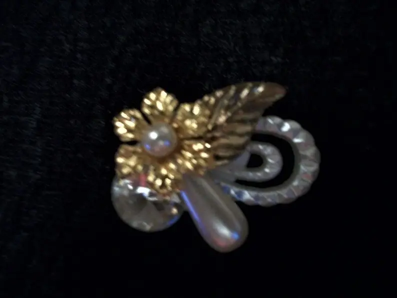 Gold flower and leaves are highlighted by a white bead center a teardrop faux pearl a large clear embellishment and an iridescent white molded plastic crown