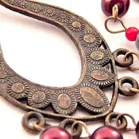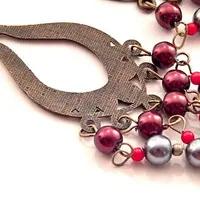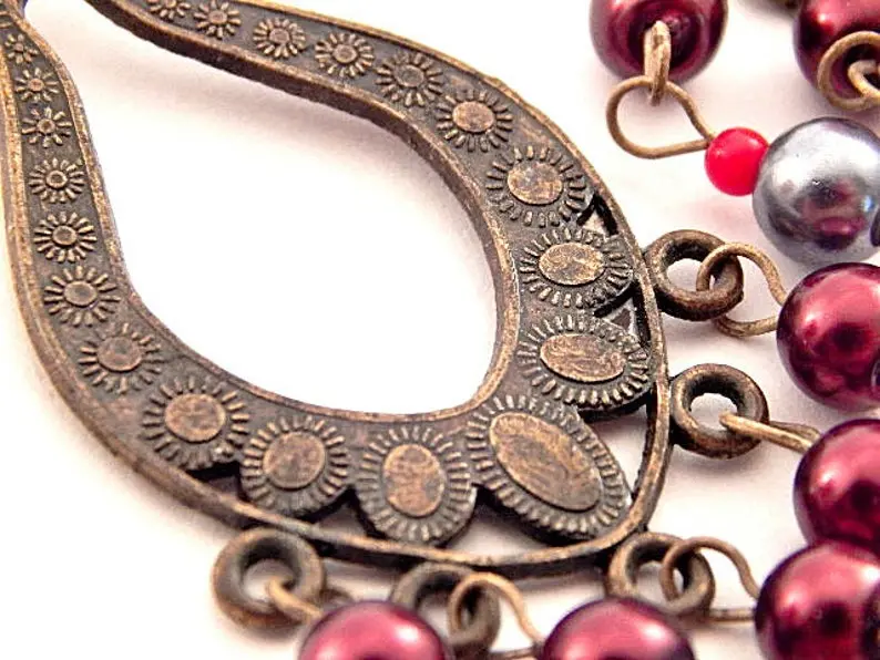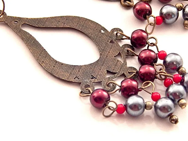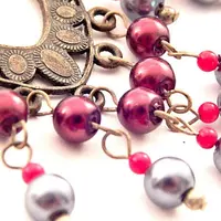 From top to bottom on antiqued metal connecting loops the beads are 5 mm metallic burgundy, 2mm red, 5mm grey metallic, 1.5mm silver