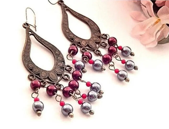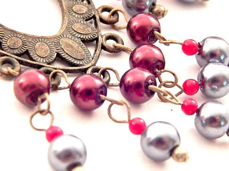 a vintage addiction, jewelry, earrings, pierced ears, hoop, dangle, beaded, antique metal, boho, hippie, tribal, purple, grey, costume jewelry, gift box,
