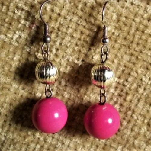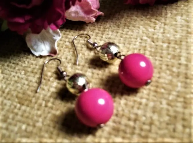 Earrings Mod Pink Bead Silver Metal Dangle Earrings with Fishhook Wires Vintage Jewelry