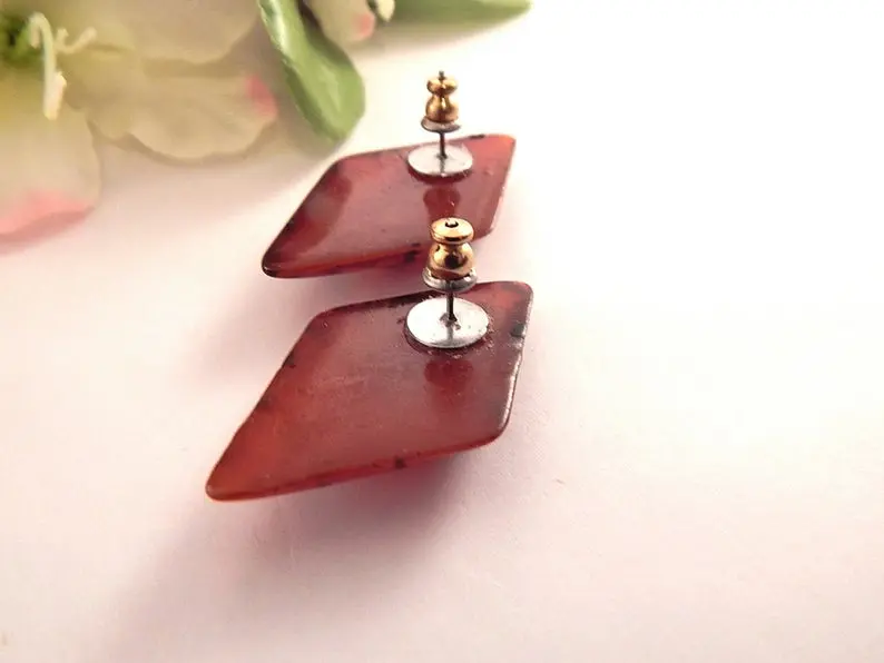 Lightweight translucent brown and black diamond-shaped drop-down earrings