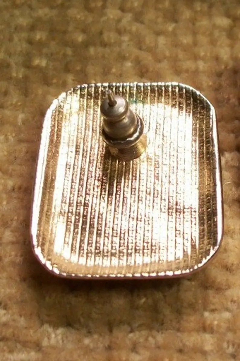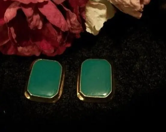Green Earrings for Pierced Ears Vintage Enameled Jewelry Teal Rectangle Gold Metal Christmas St. Patrick's Day Holiday Fashion Accessory