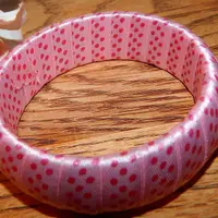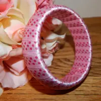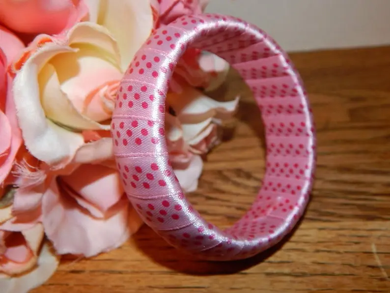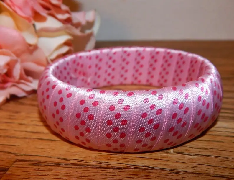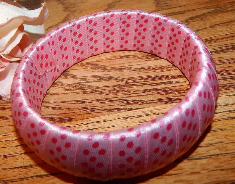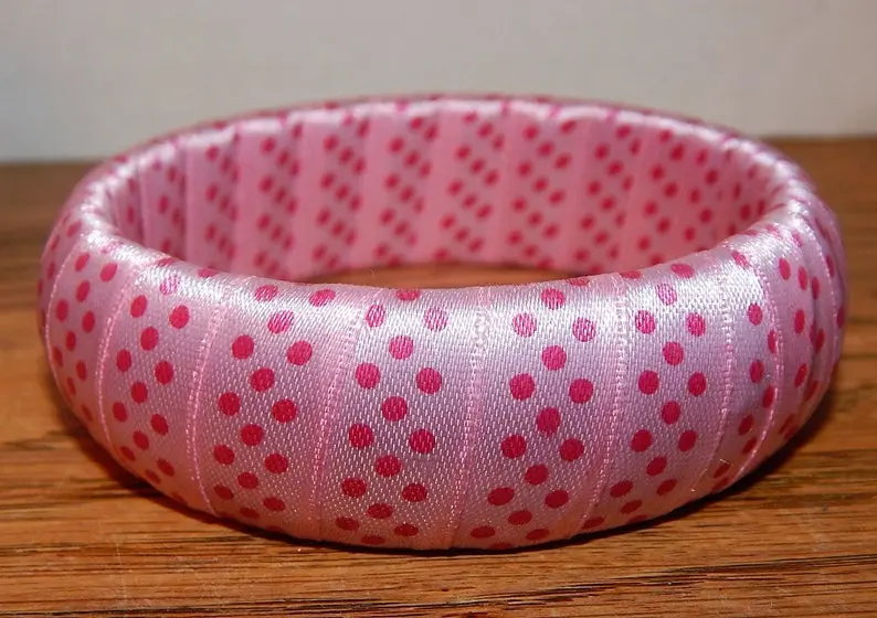 Womens Bracelet Pink Polka Dot Fabric Ribbon Wrapped Bangle Vintage 1980s Fashion Jewelry Costume Accessory