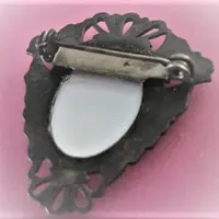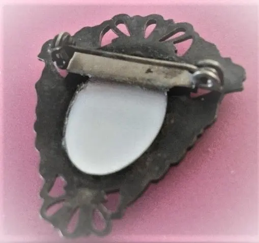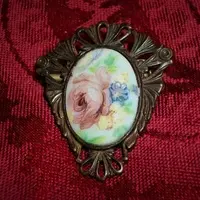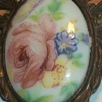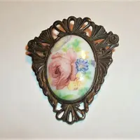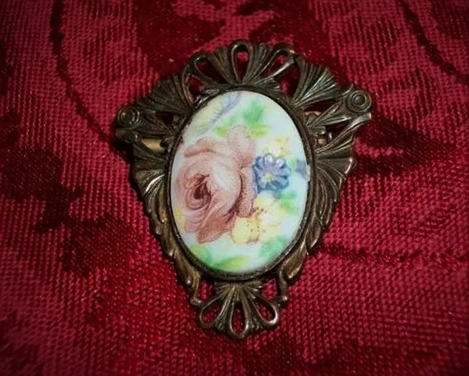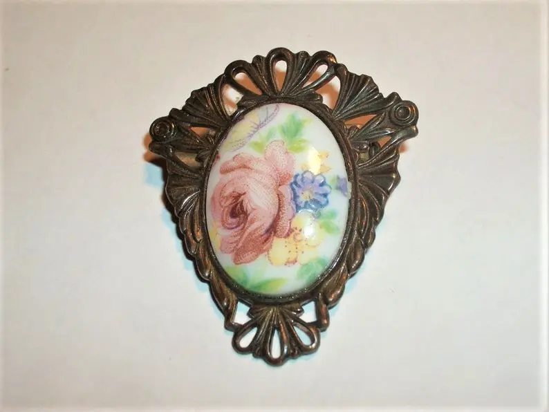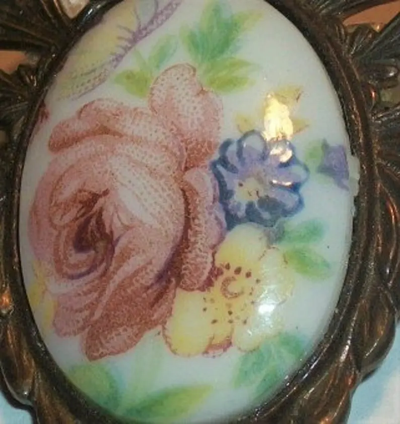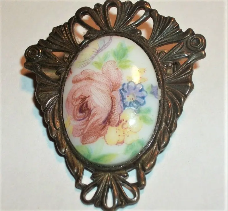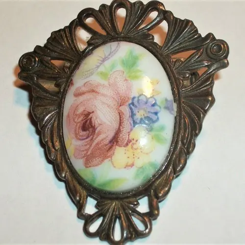 Victorian Brooch Antique 1940s Pin Filigree Metal Oval Porcelain Transferware Cabochon Yellow Blue Floral Pink Rose Jewelry