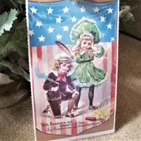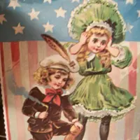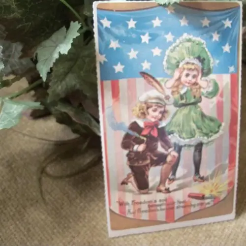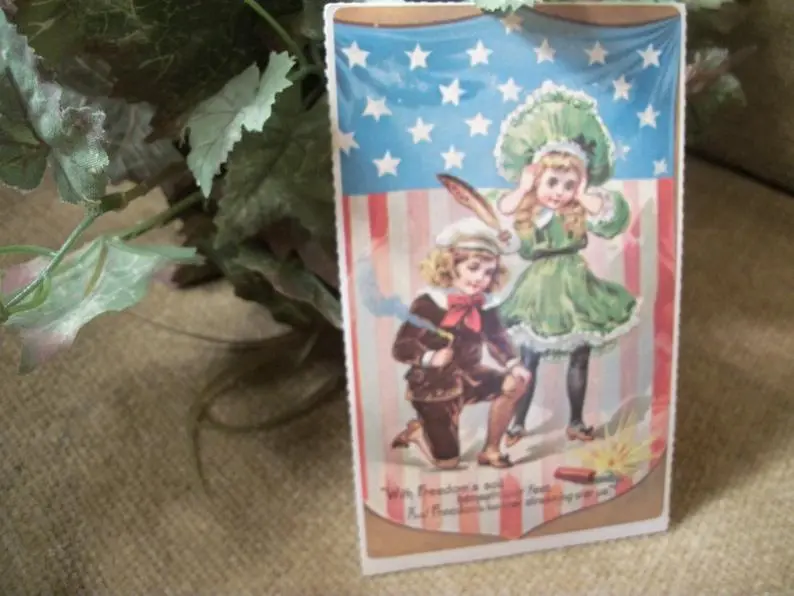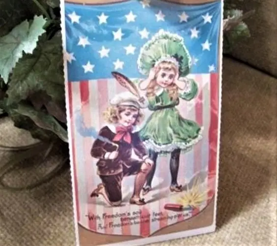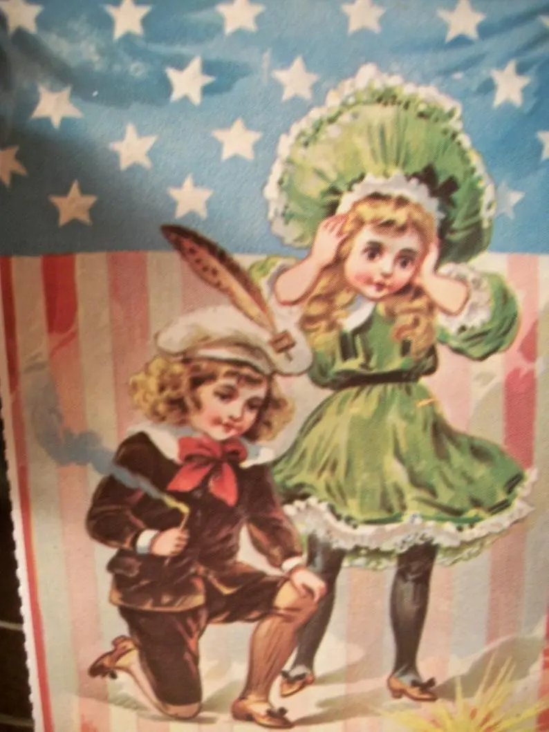 American Flag Post Card Vintage 1930s Fireworks Freedom Victorian Boy Girl Independence Day Picture Papercrafts Decoupage Supply