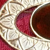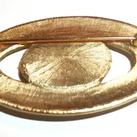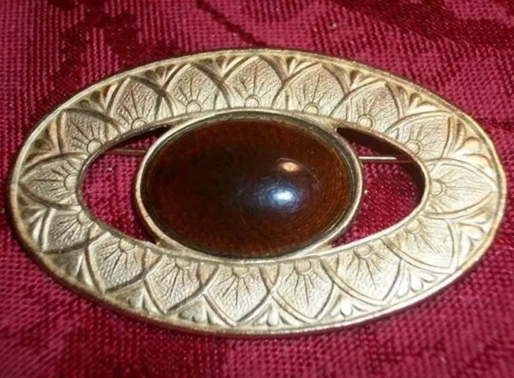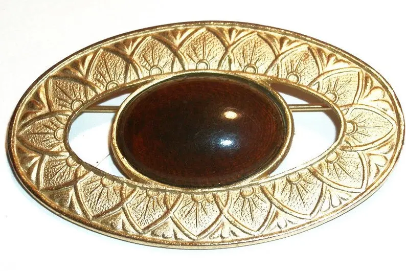 Brooch Geometric Leaf Pattern Oval Pressed Gold Metal Brown Stone Cabochon Vintage 1980s Fashion Jewelry Coat Scarf Pin