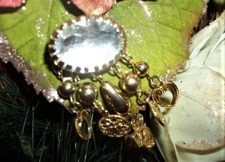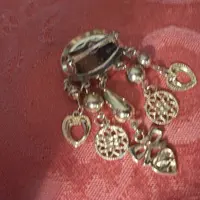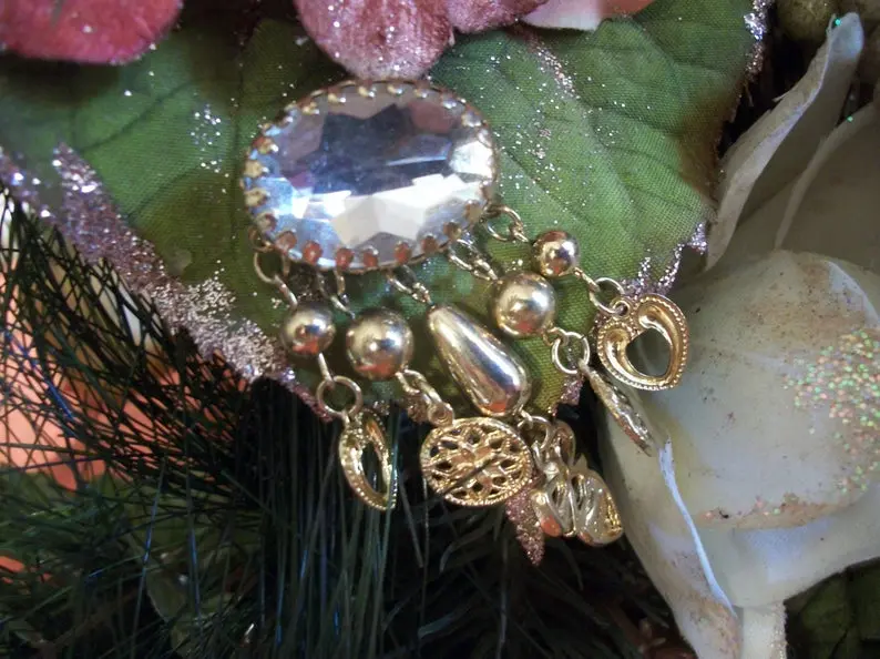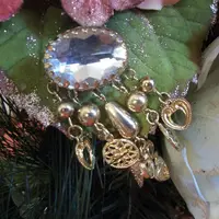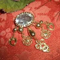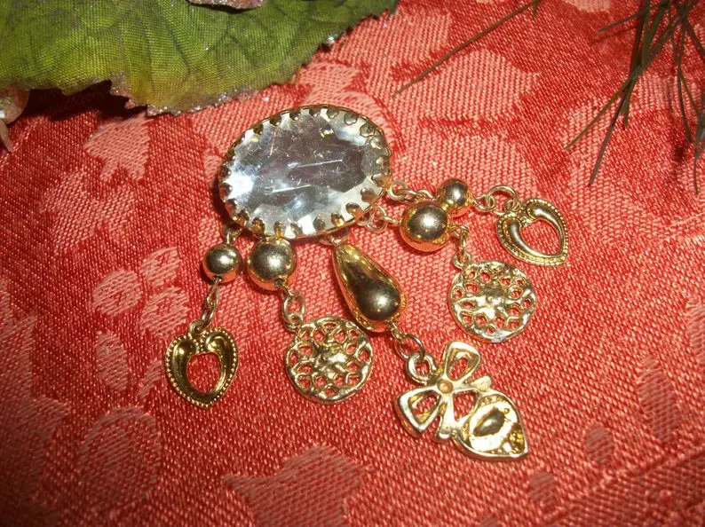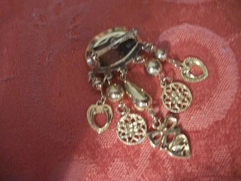 vintage, jewelry, pin, brooch, charms, hearts, flowers, beaded, gold metal, art nouveau, dangle charms,