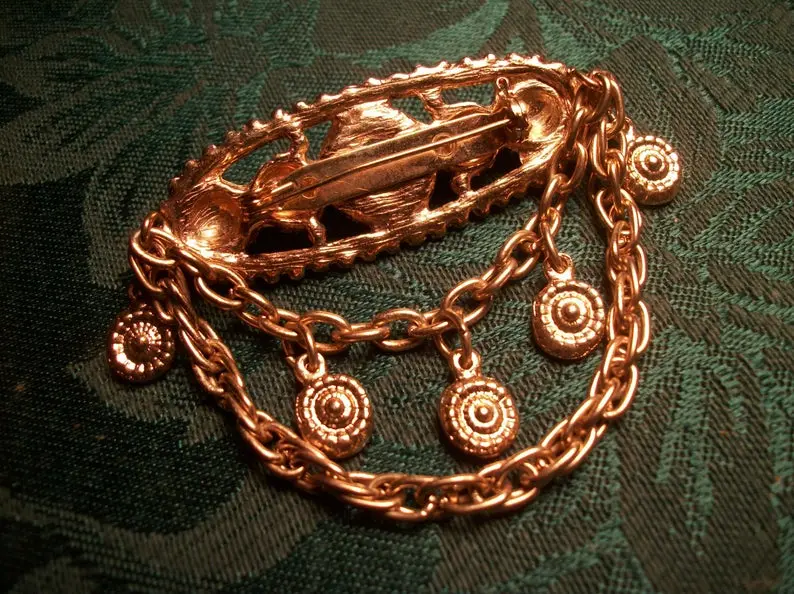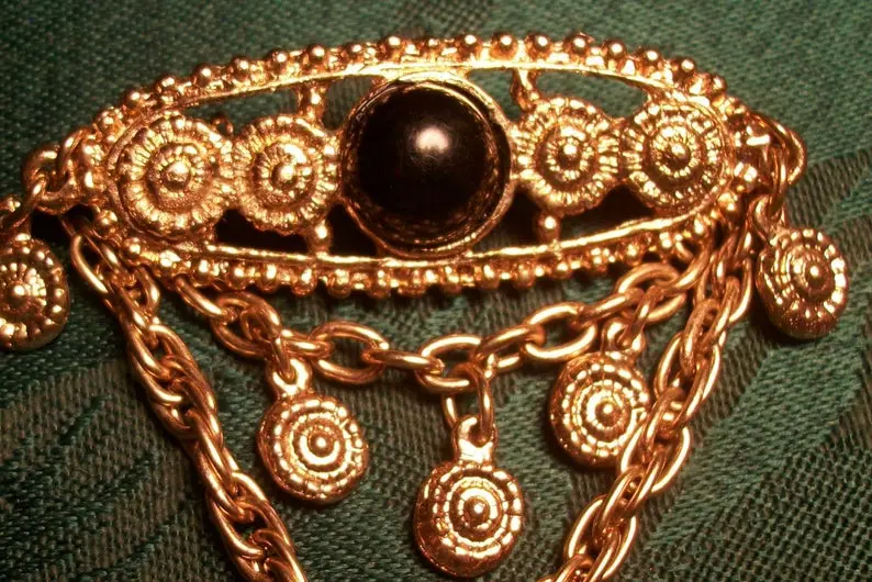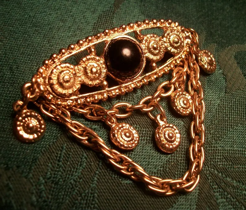 Medallion Chain Brooch Vintage 1980s Edwardian Style Womens Jewelry Gold Metal Chatelaine Bar Pin with Brown Cabochon