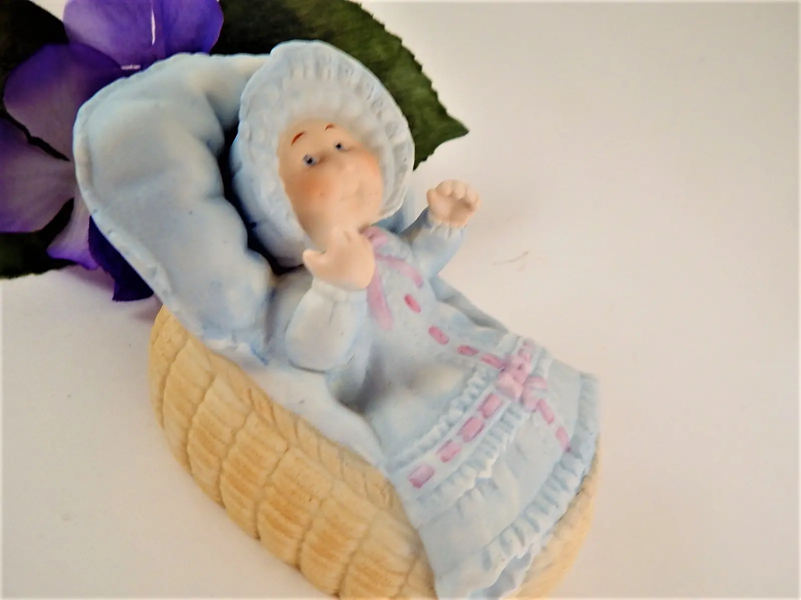 Baby laying in a bassinet, wearing a blue gown and bonnet.