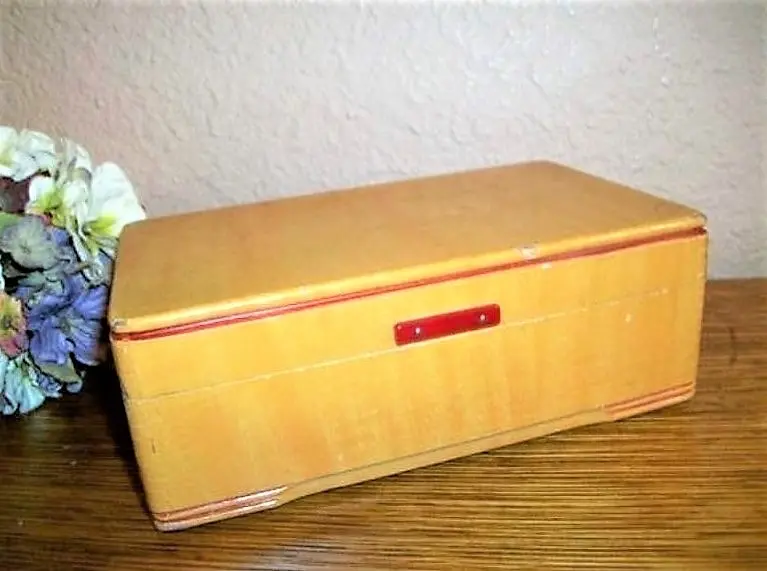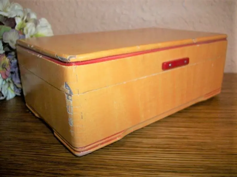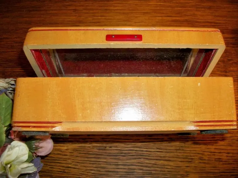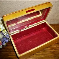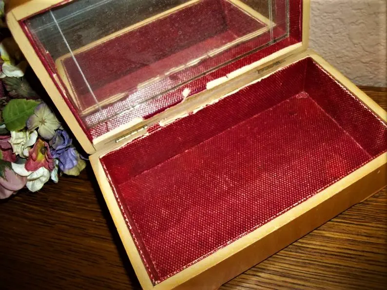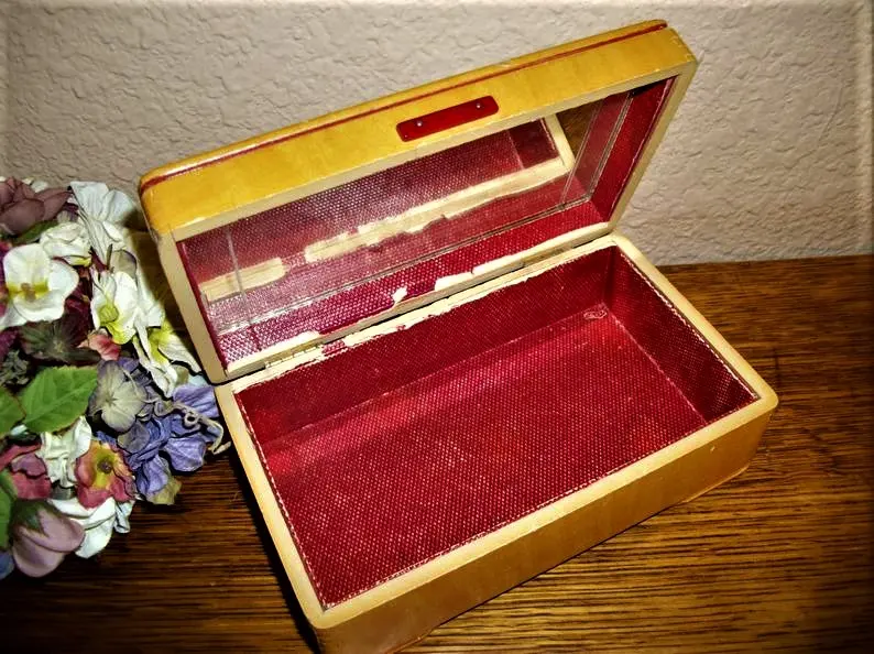 vintage, home storage, jewelry box, unisex mens womens, blond wood, red lined lining, trinket box, jewelry chest, mirrored box, antique WWII 1930s, flip top box, dresser top box, depression era, unisex jewelry box, mens accessory case