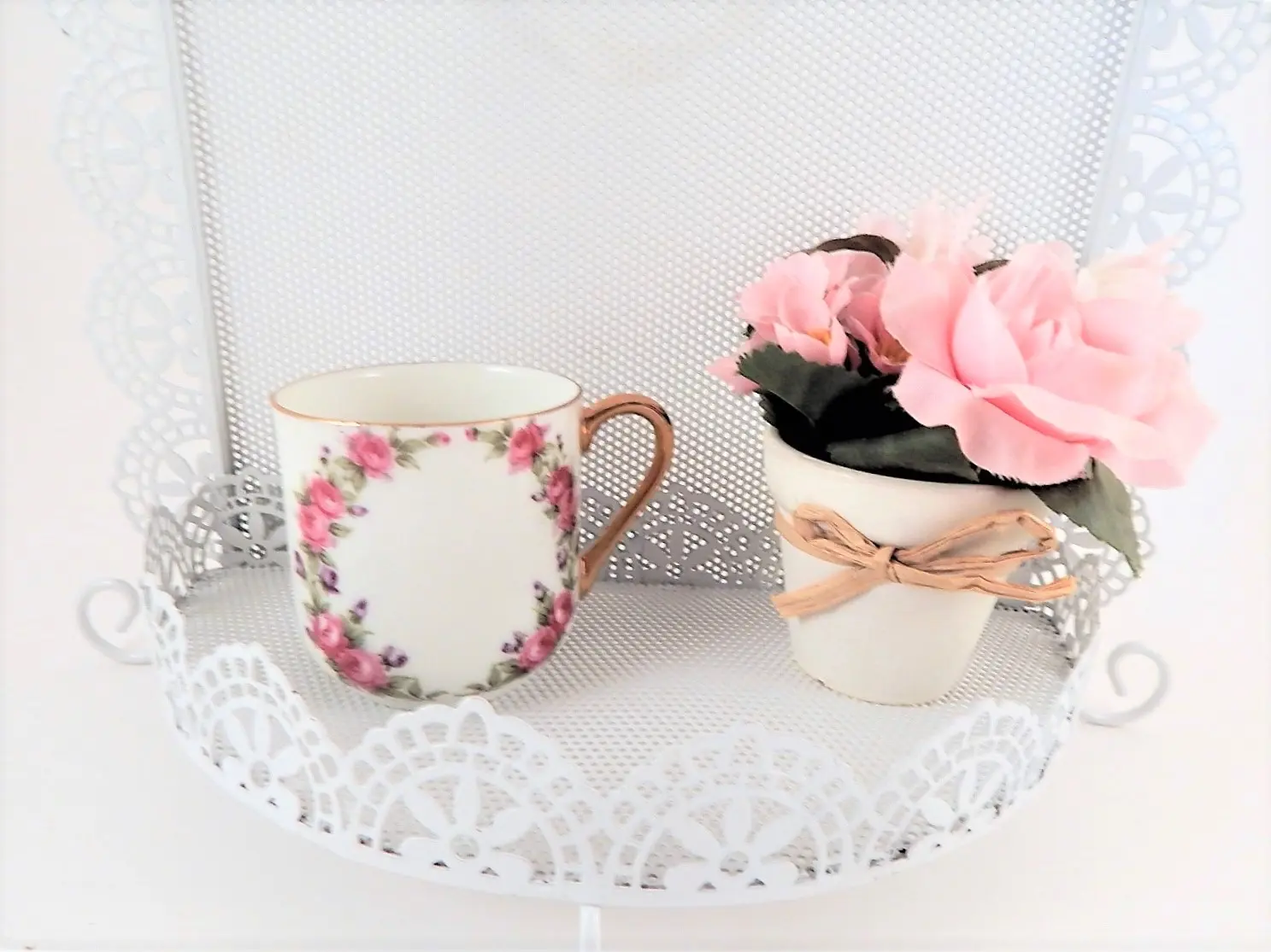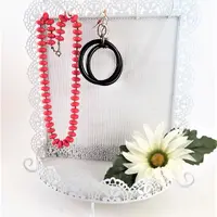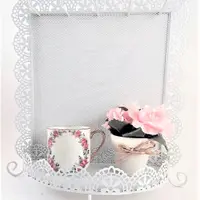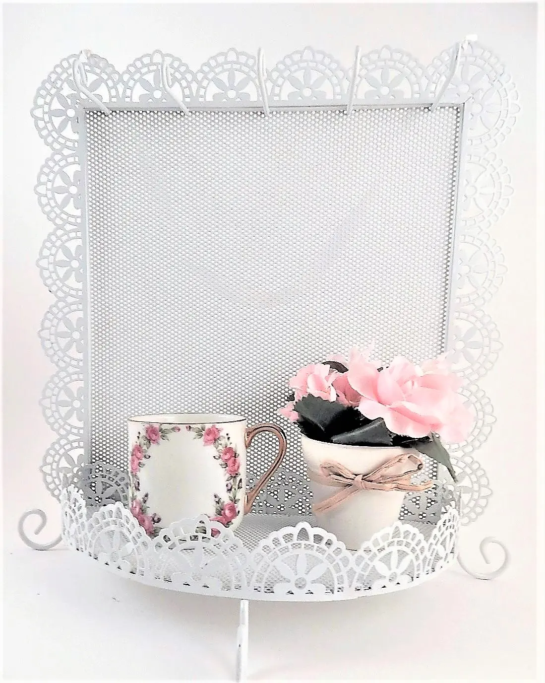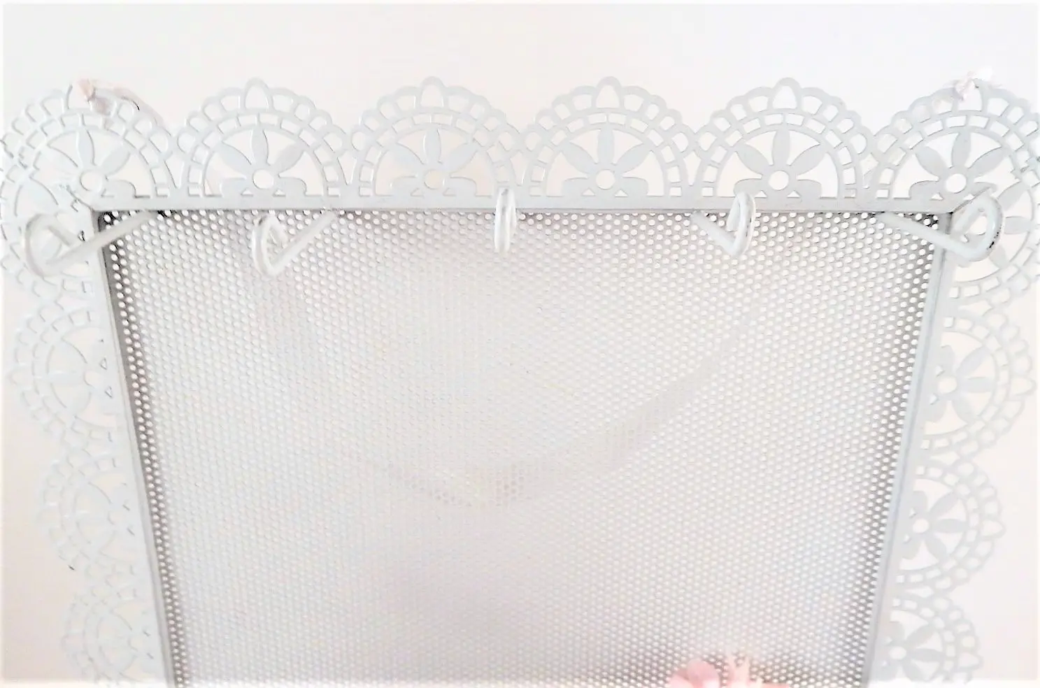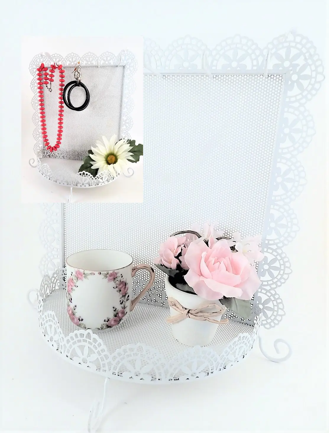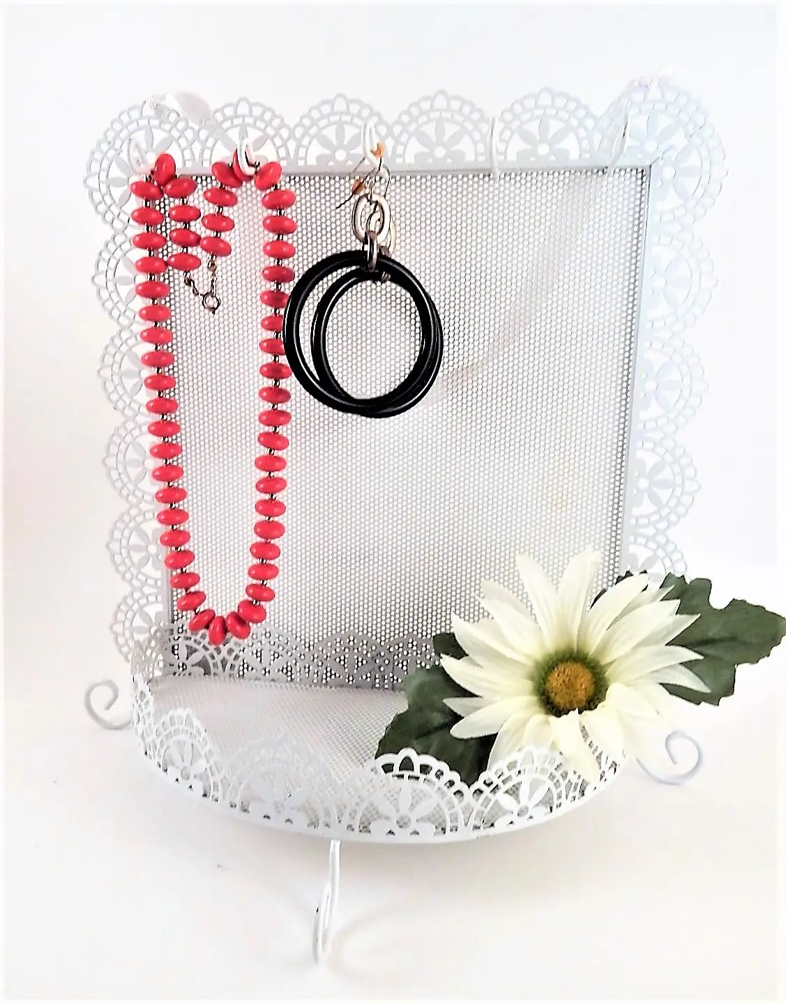 Jewelry Storage Rack Earring Organizer Necklace Hooks Dresser Top Accessory Tray Wall Hanging Scalloped Edge Filigree White Metal Boudoir Decor