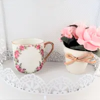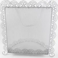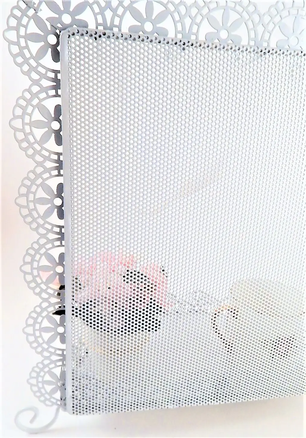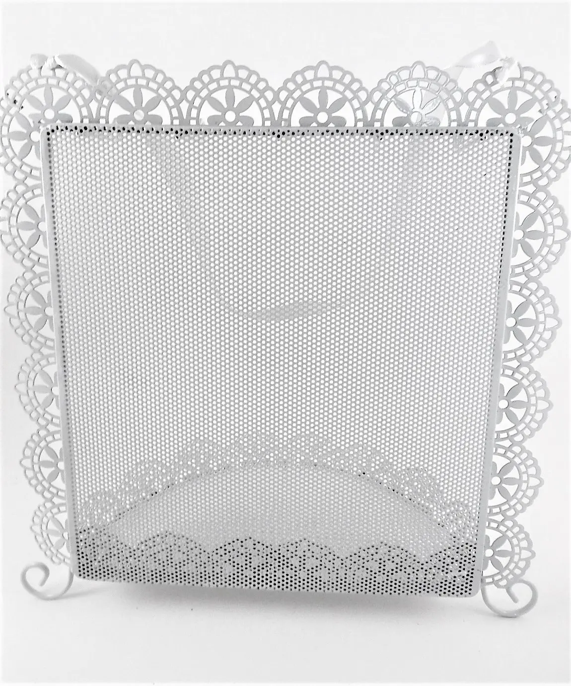 Shiny white metal with scalloped filigree details.
