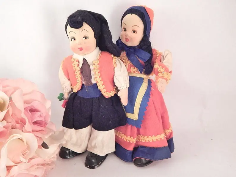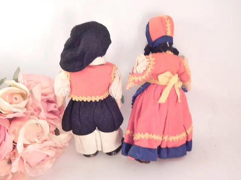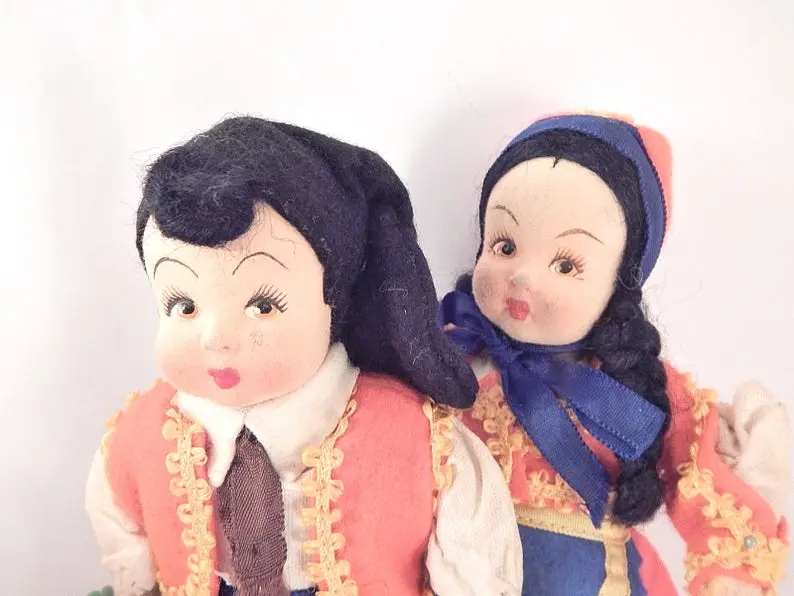 Boy and Girl Dolls Italian Heritage Vintage 1930s 8" Fabric Stockinette Felt Mask Face \ Old World Europe Display Doll Set