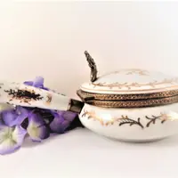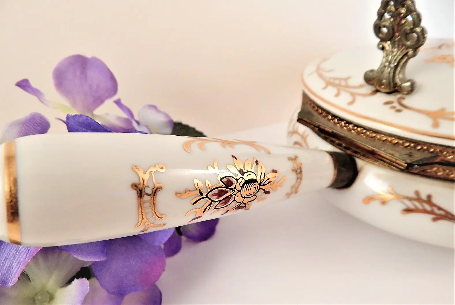 Alt Tags: Silent Butler White Porcelain Crumb Catcher Vintage 1950s ISCO Japan Mid Century Gold Gilt Hollywood Regency Formal Table Accessory