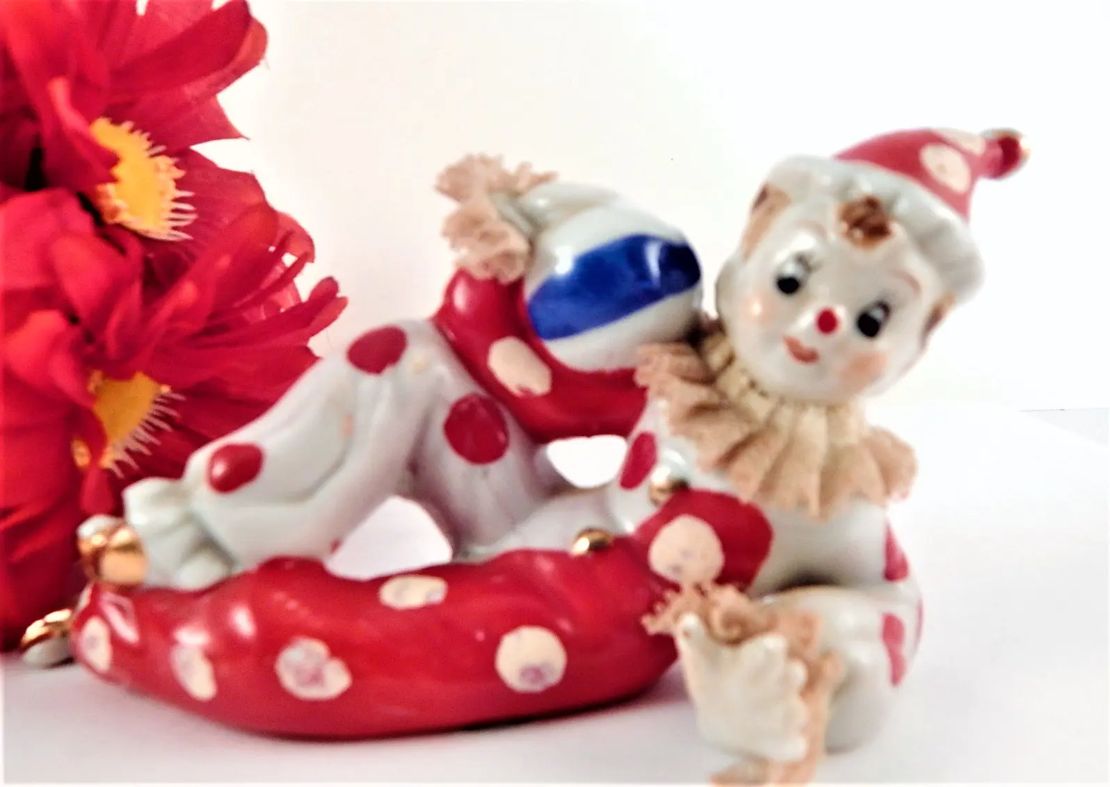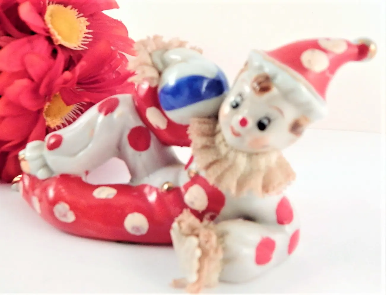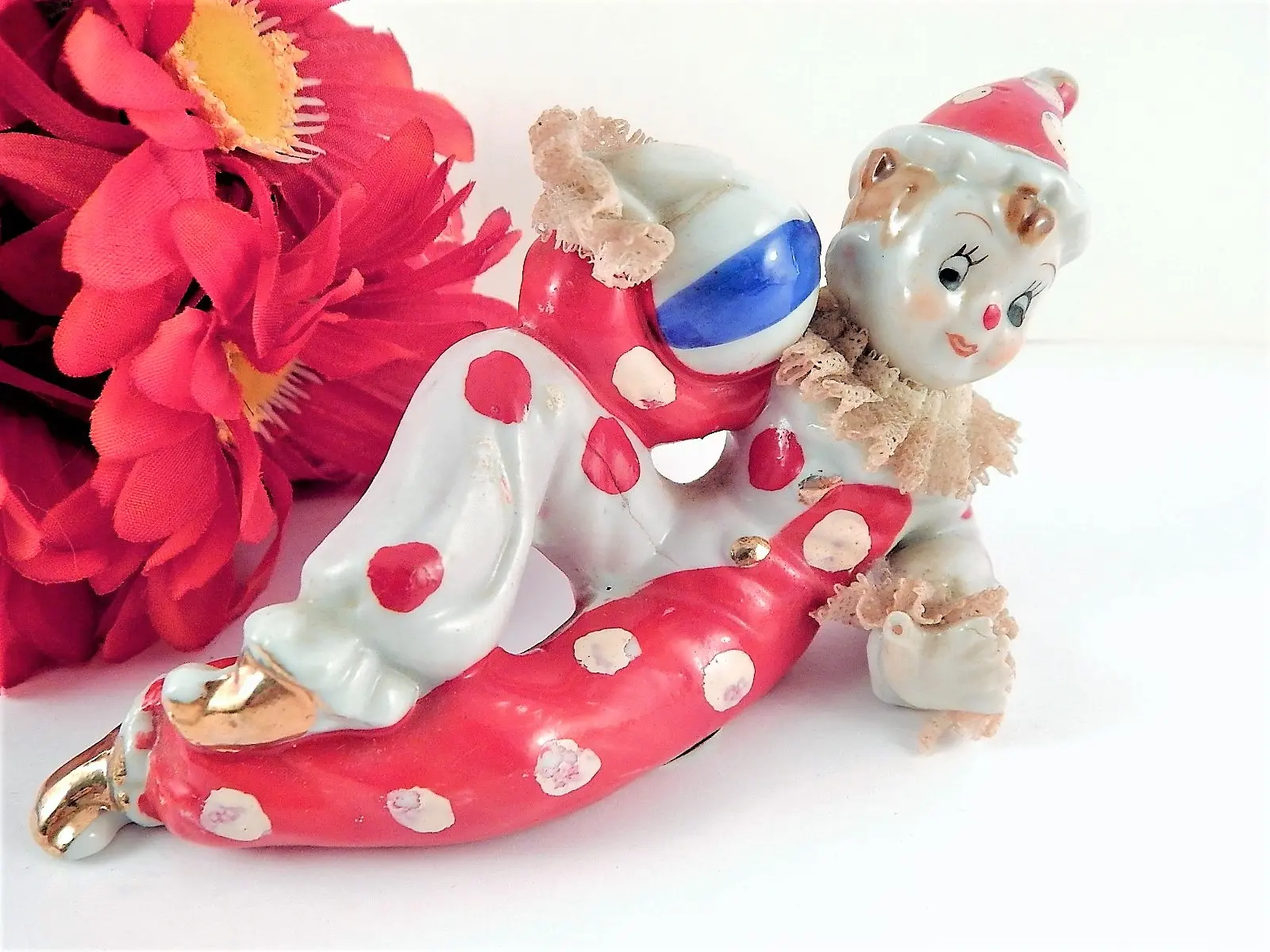 Alt Tags: Clown Figurine Vintage 1950s Wales Japan Red and White Handpainted Porcelain Tramp Circus Clown Boy Harlequin Jester Perriot Clown Knick Knack Kitsch Clown Collector Gift