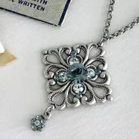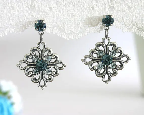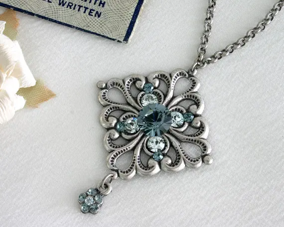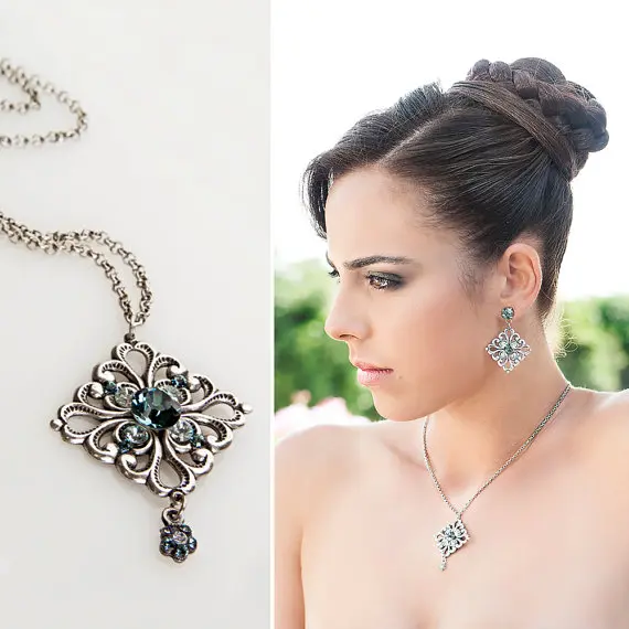 Anniversary jewelry set was named Anne and made from Antique silver plated brass and set with two special picks of light blue Swarovski crystals.