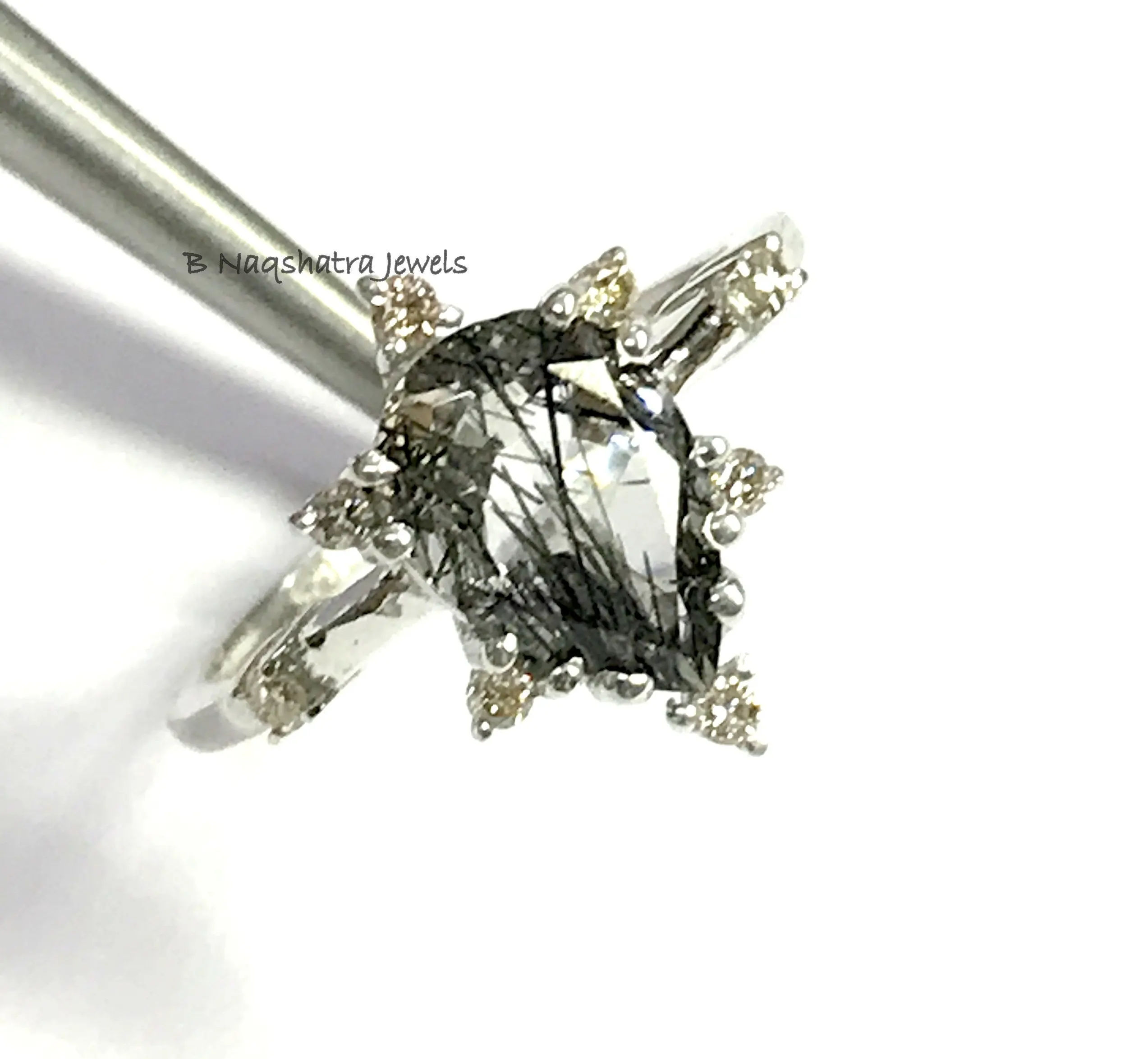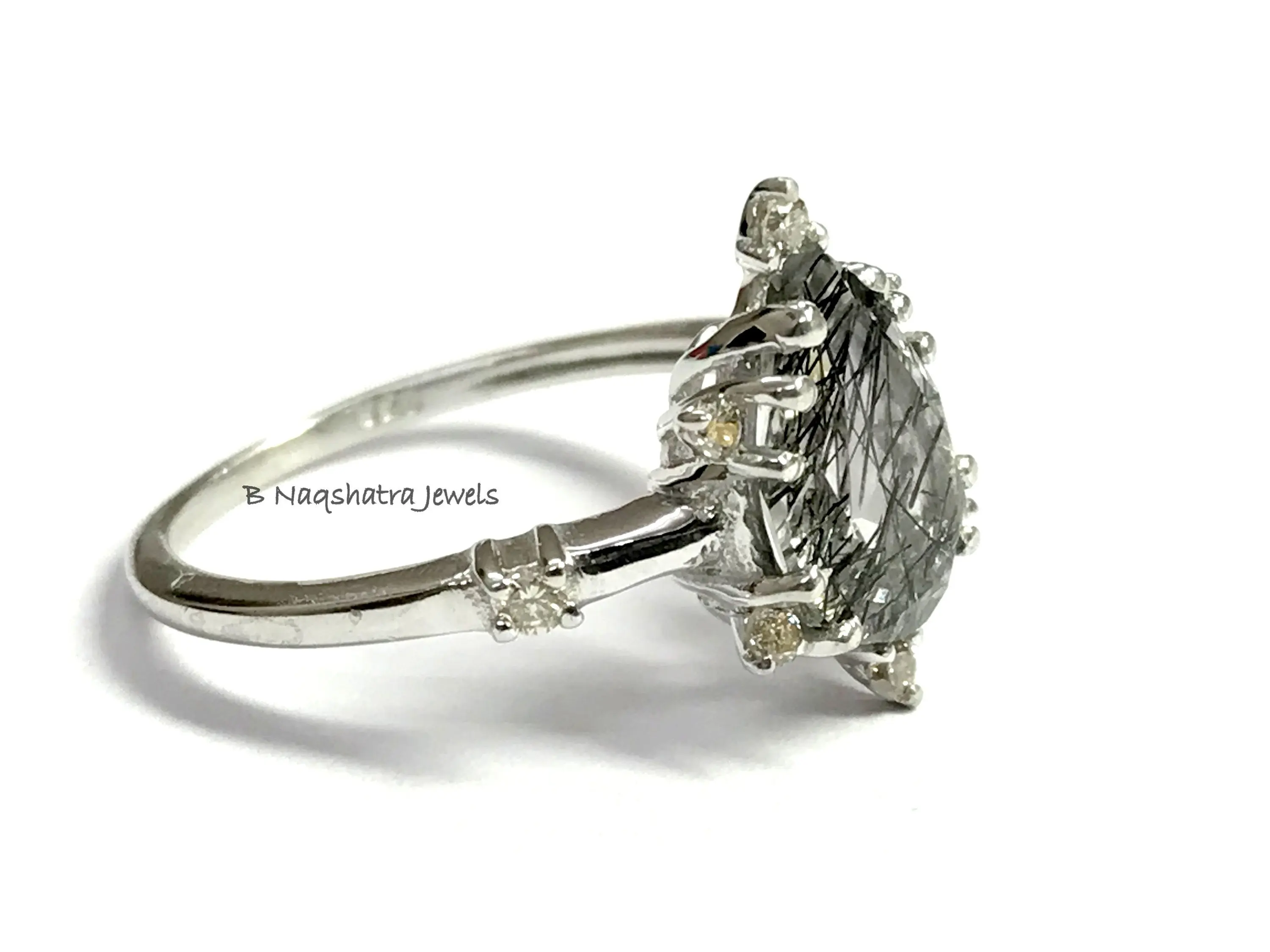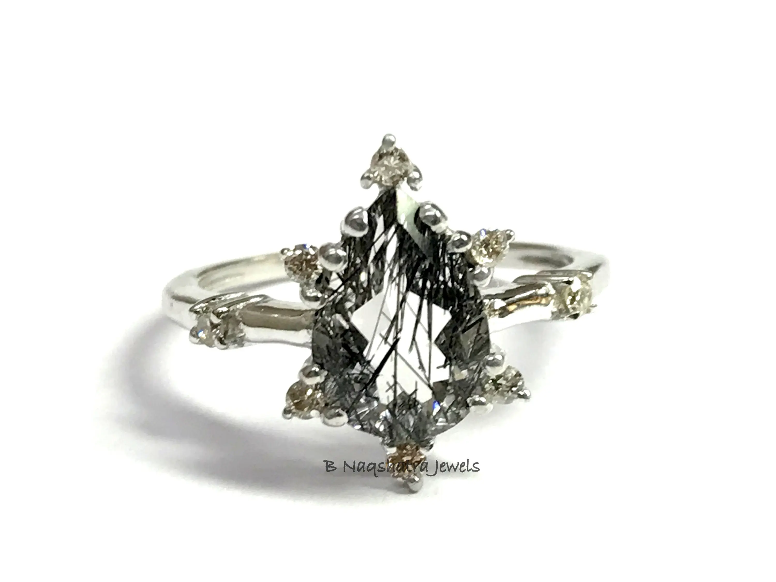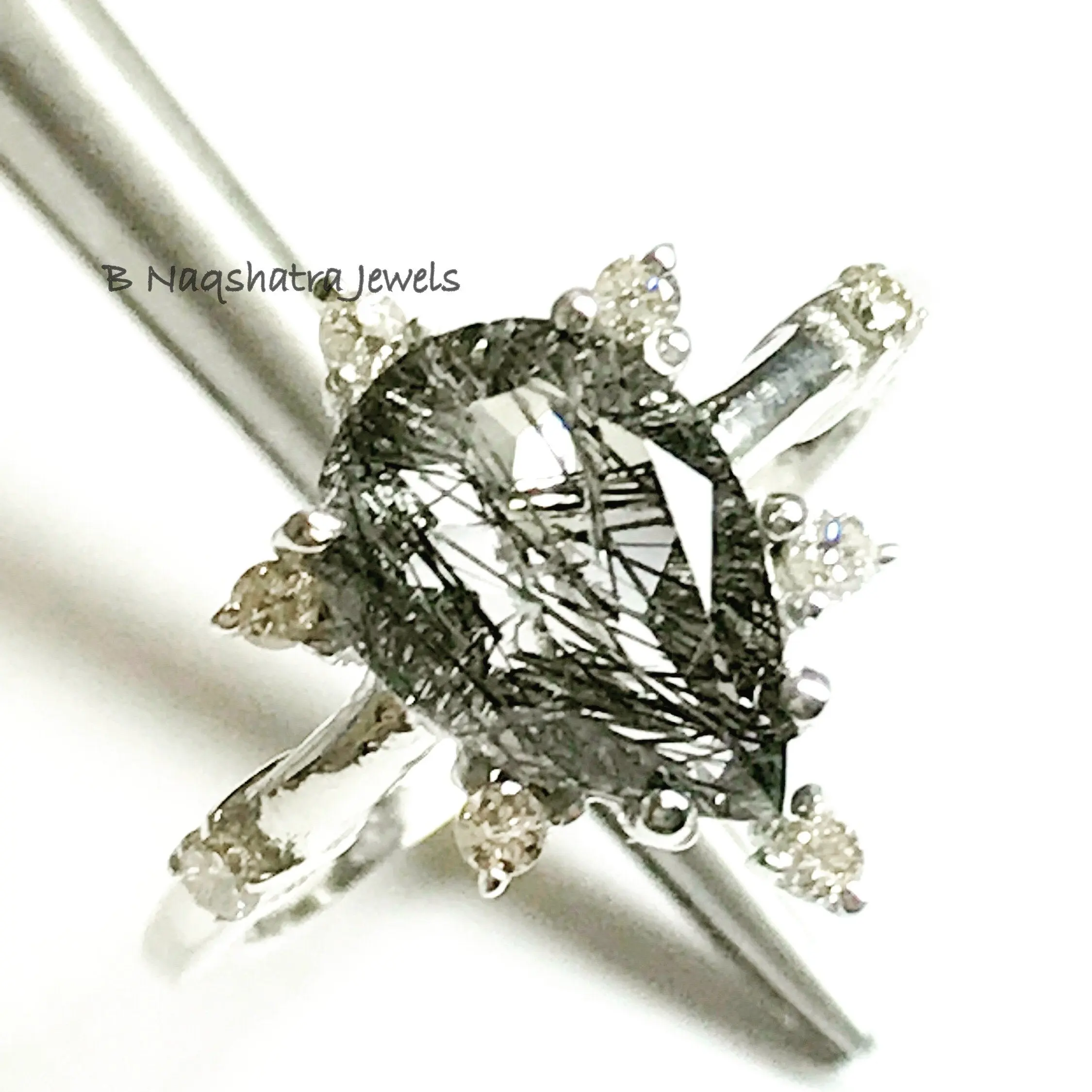 BLACK RUTILE QUARTZ 925 Sterling Silver Ring with Diamonds , Tear Drop Rutile Quartz , Pear Shape Gemstone , Gemini & Taurus Gemstone.................