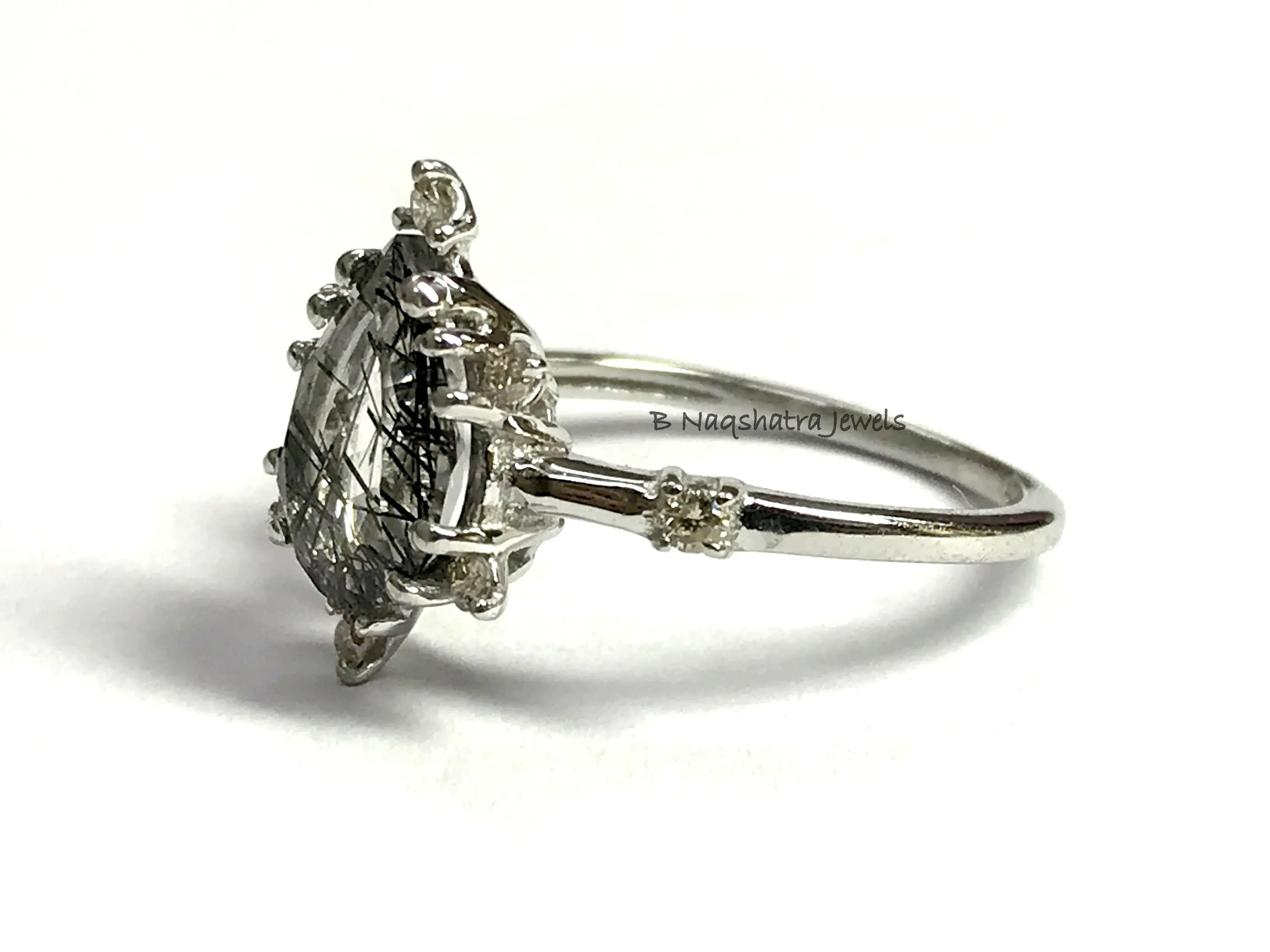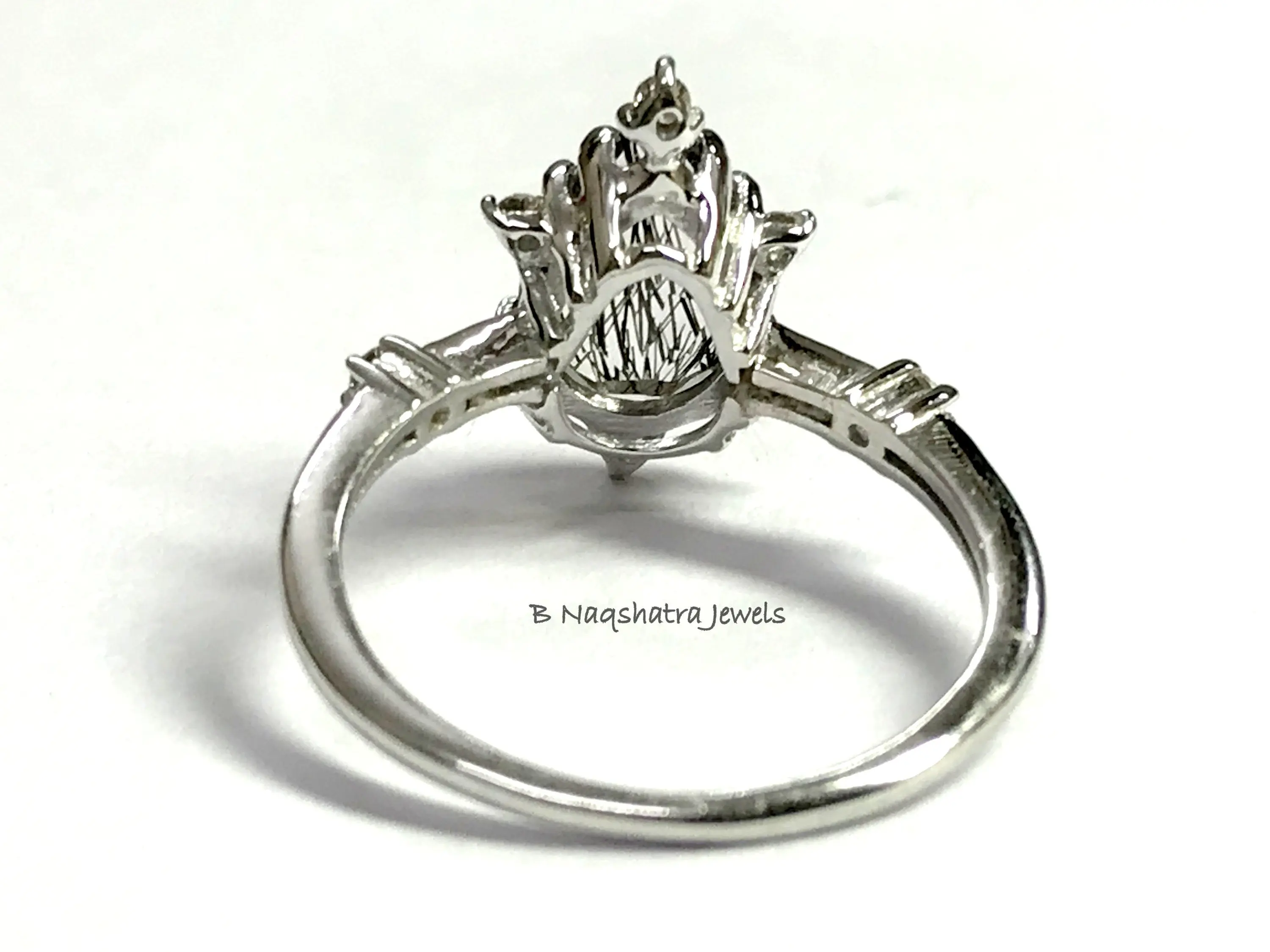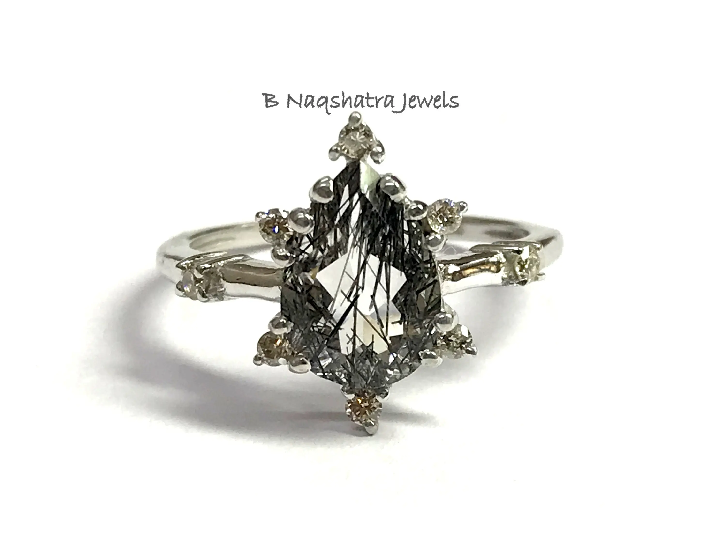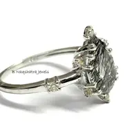 BLACK RUTILE QUARTZ 925 Sterling Silver Ring with Diamonds , Tear Drop Rutile Quartz , Pear Shape Gemstone , Gemini & Taurus Gemstone.................