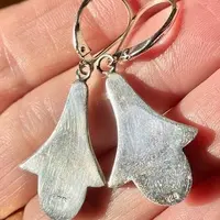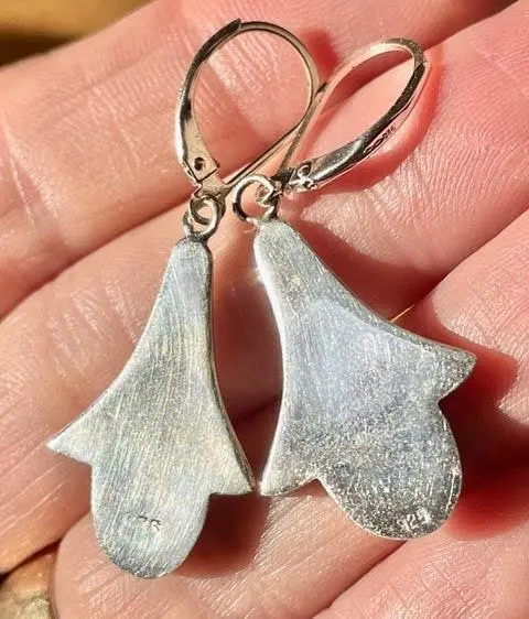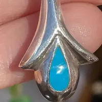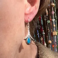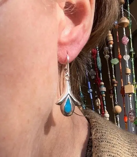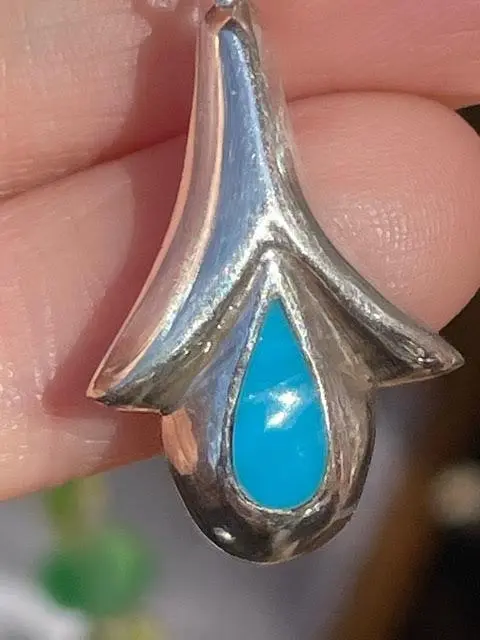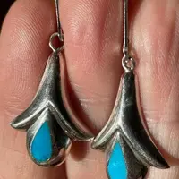 Sterling with turquoise enameling. We swapped their old stainless shepherd's crook ear wires for new sterling lever-backs that guarantee you will never lose one.