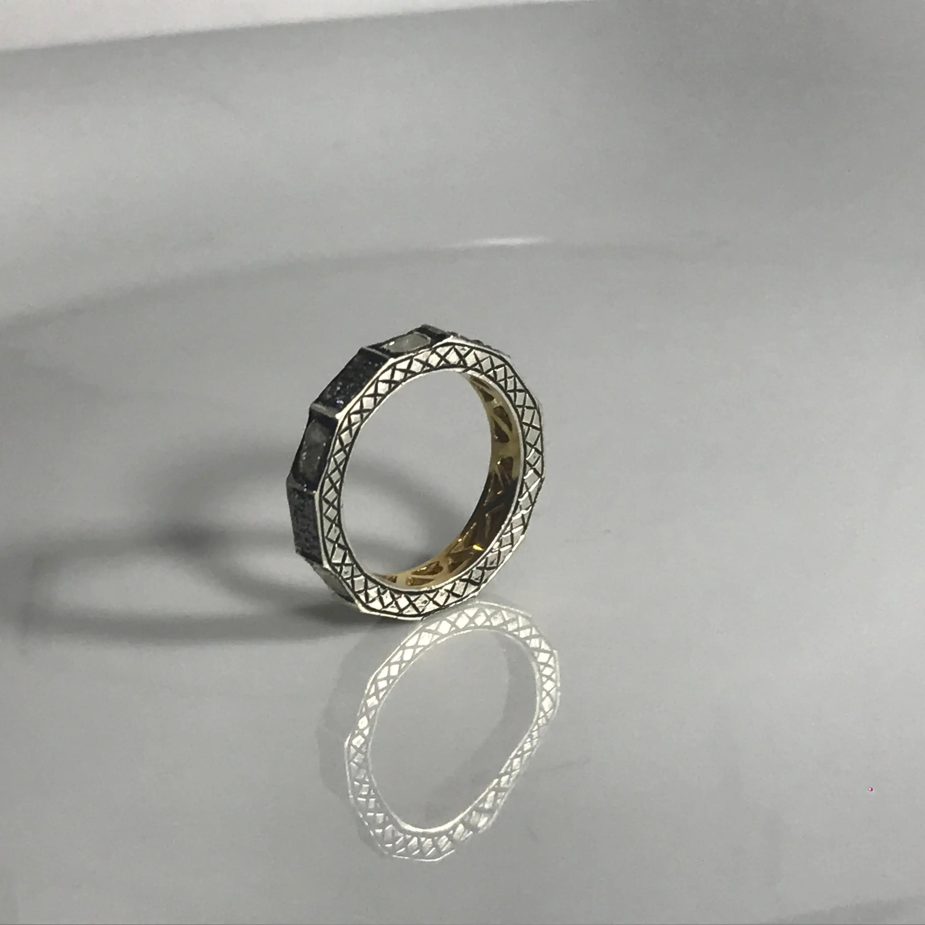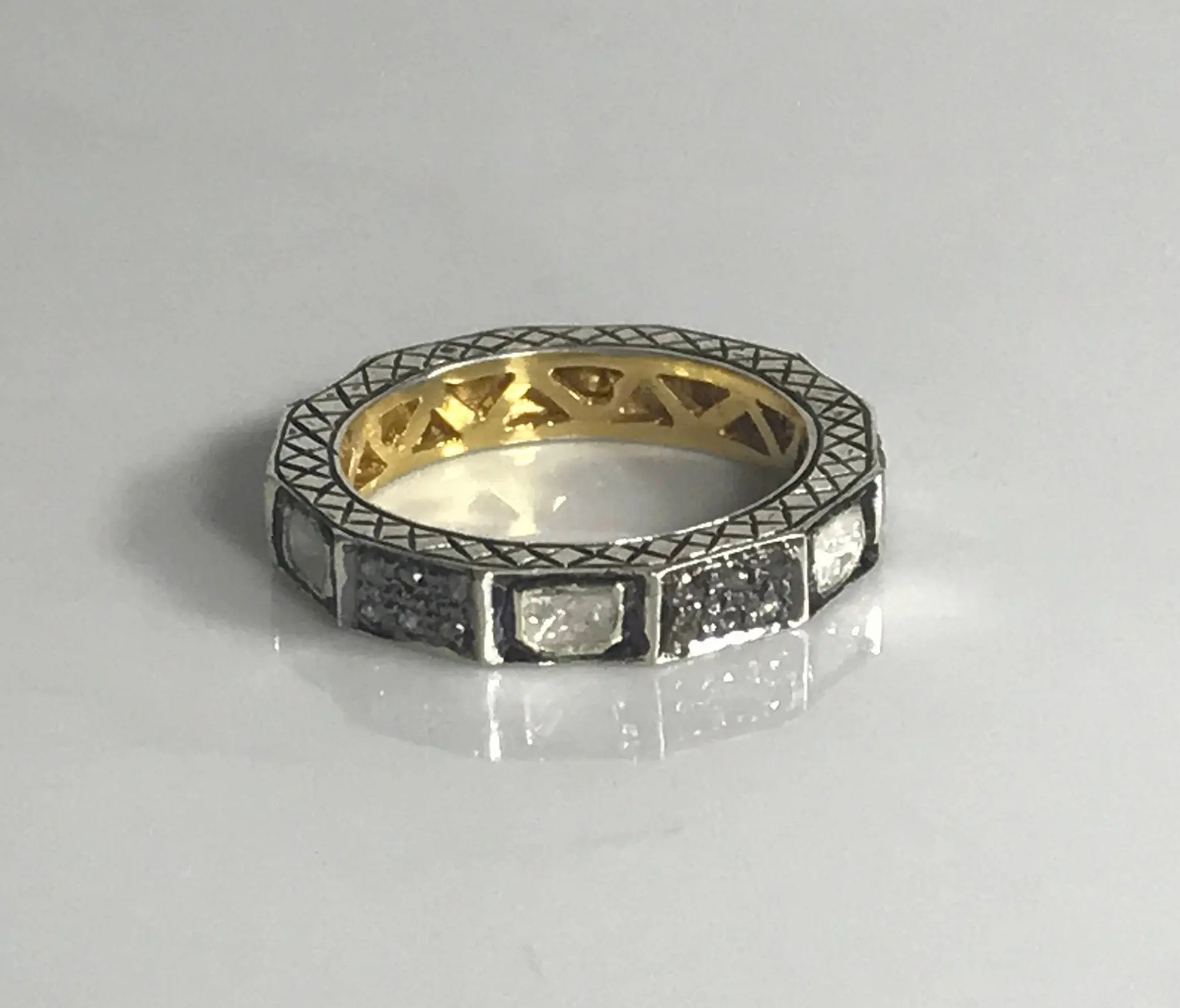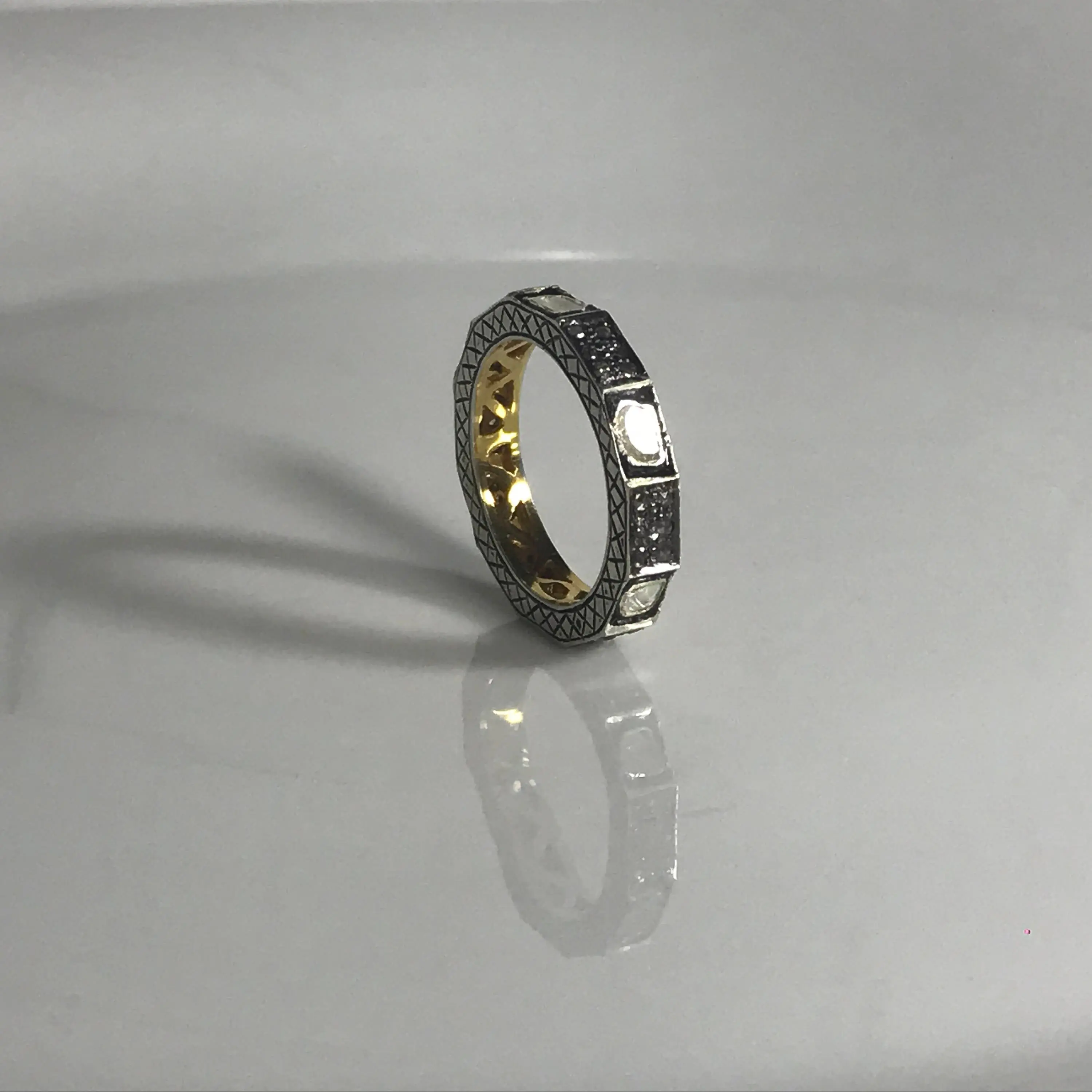 single solitaire hand cut diamond Eternity band ring studded with 100% natural Rose cut diamonds in pave set......and black rhodium and gold plated plated......