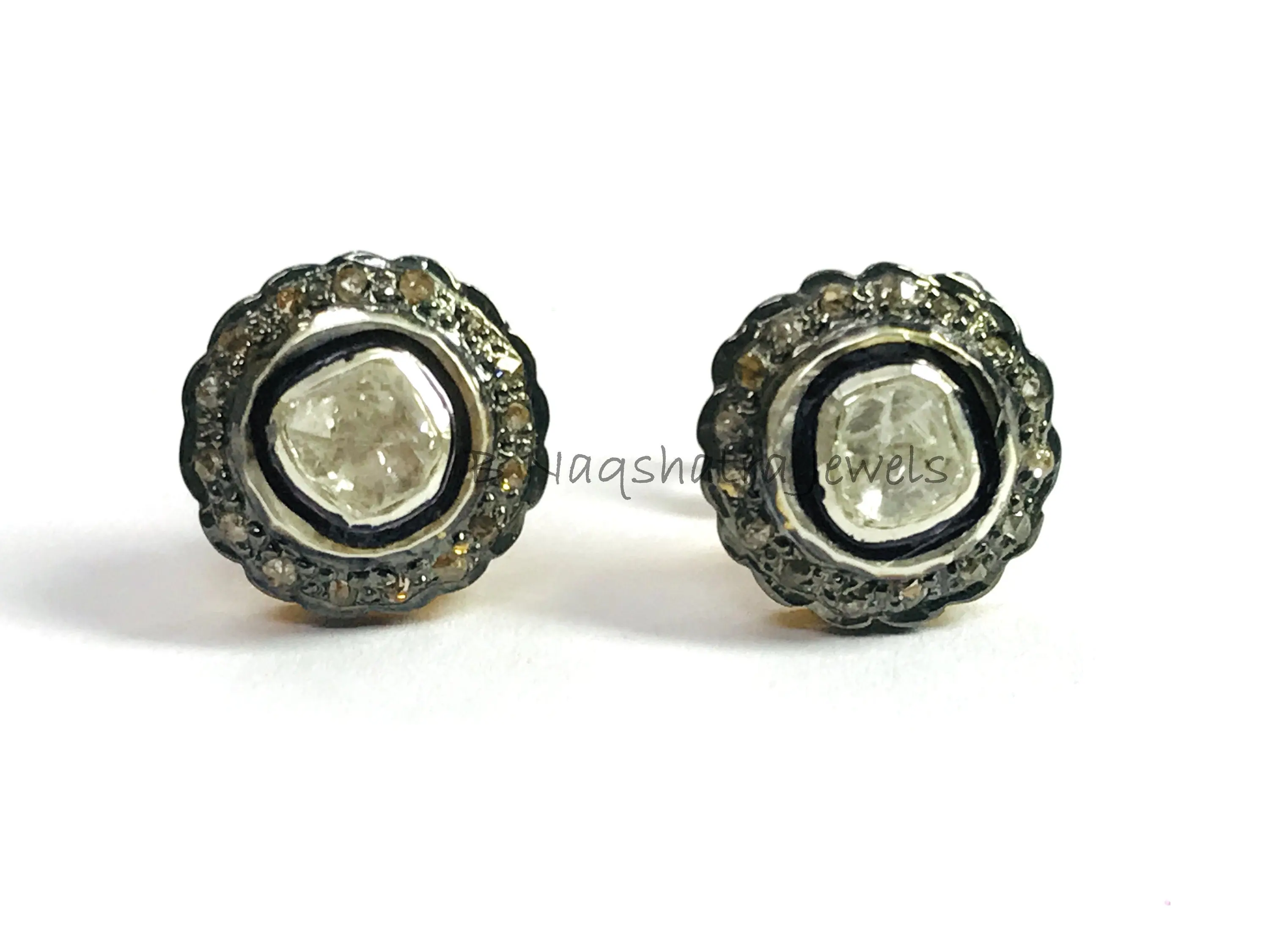 DIAMONDS POLKI STUD Earrings ,925 Sterling Silver,Women Jewelry, Vintage Style ,Antique Finish , Mothers Day Gift , Diamonds Halo , Cluster