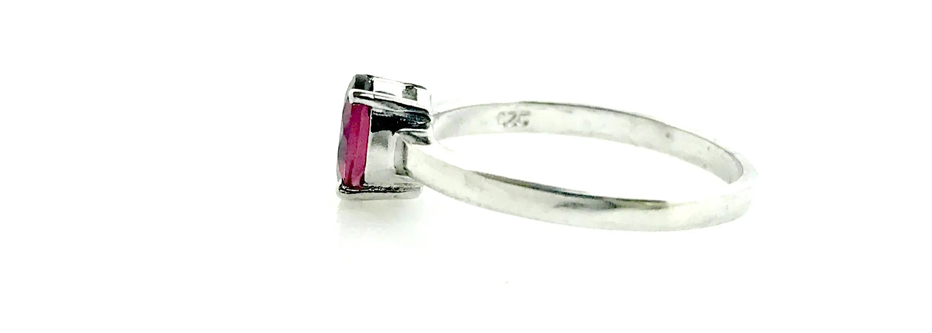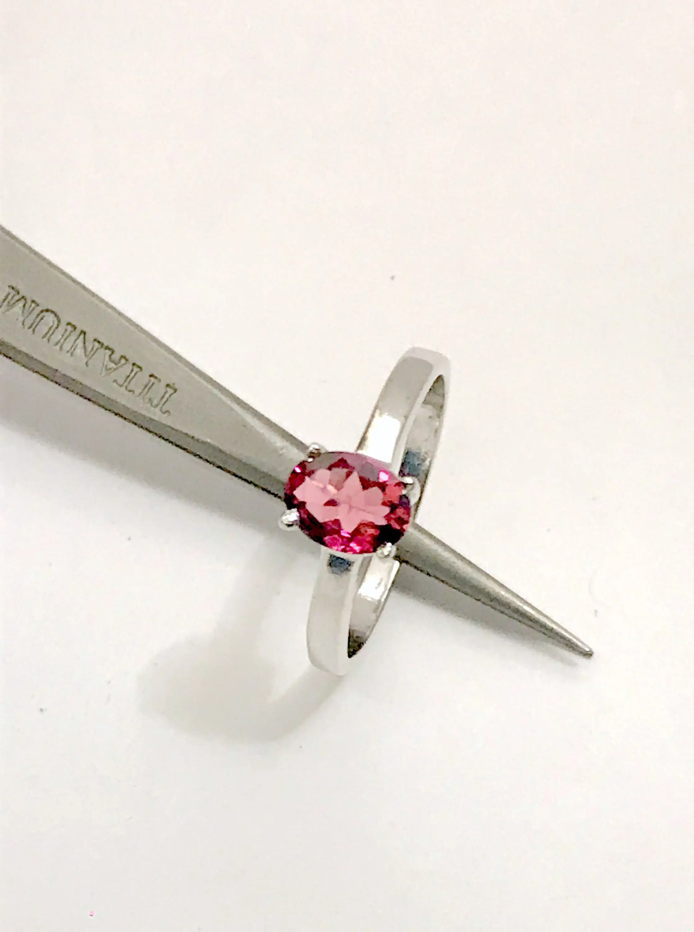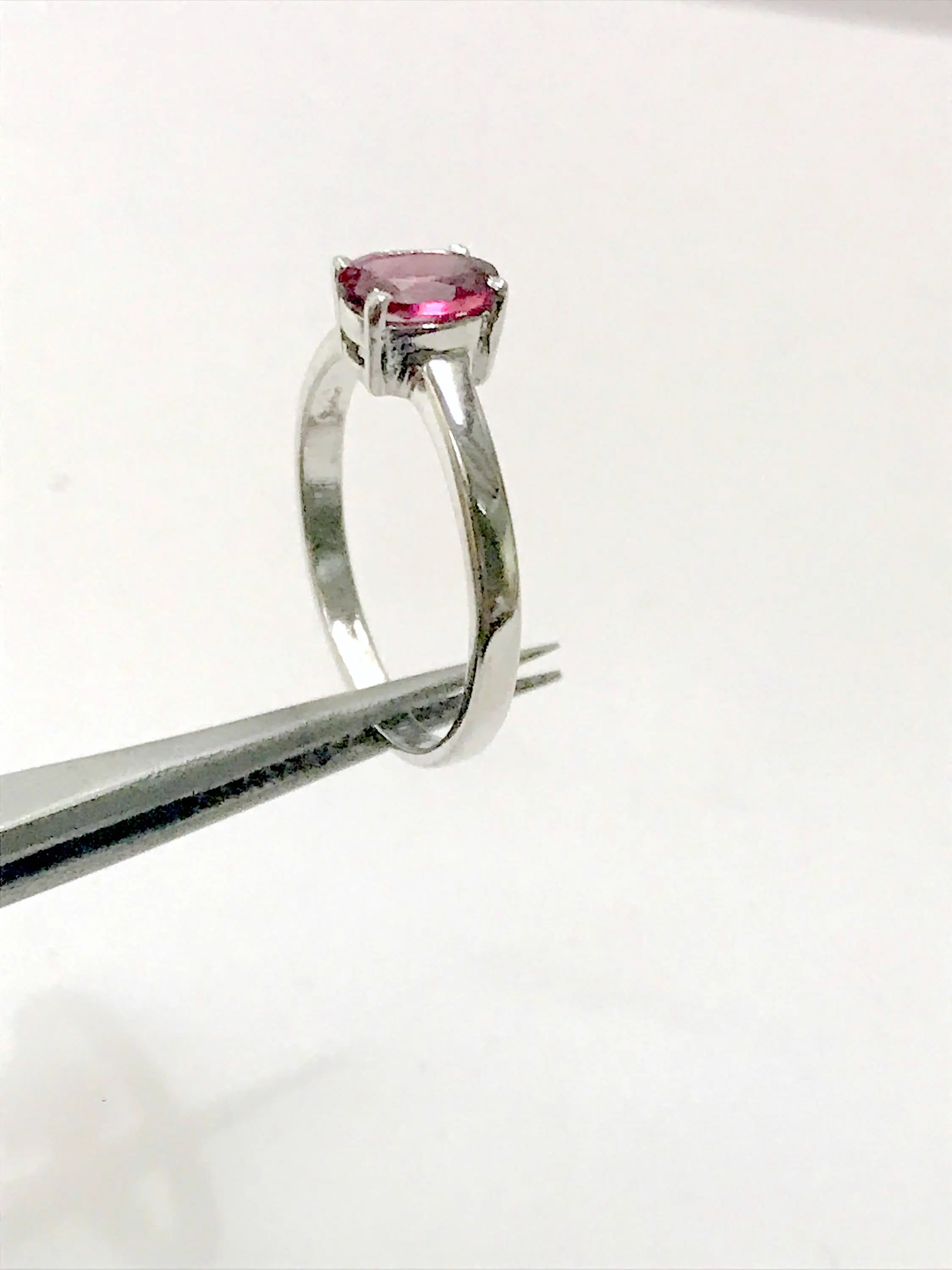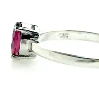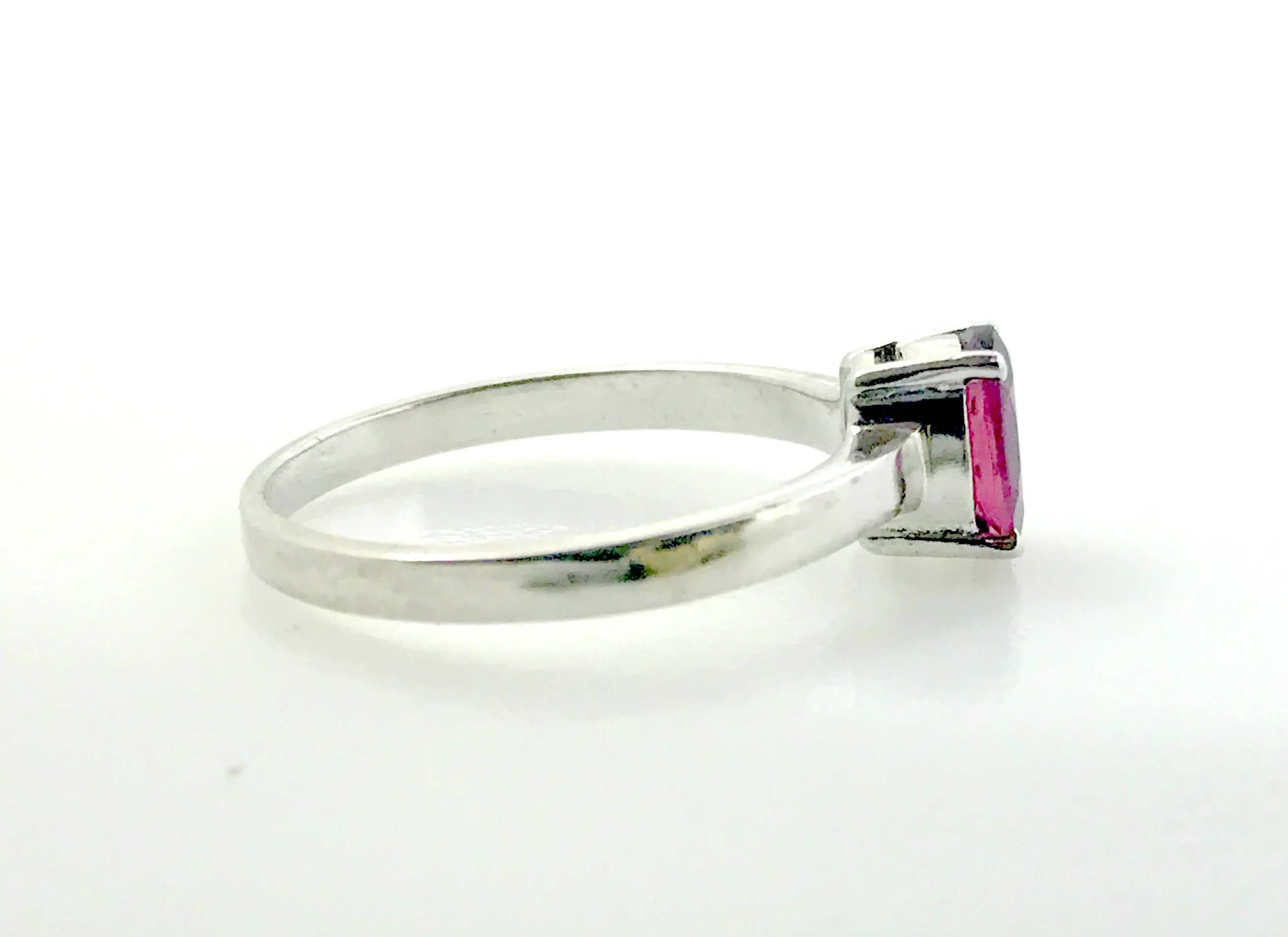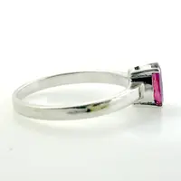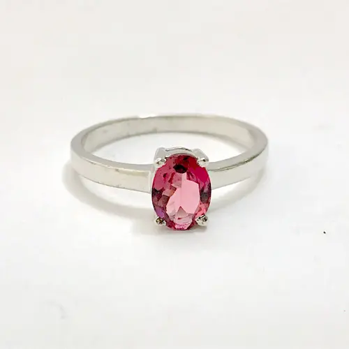 This gorgeous ring holds a fascinating faceted deep pink tourmaline. Its been set by hand on a hand-forged sterling silver ring. A stunning piece, it can easily be worn on its own or stacked with others. This stone is emerald-cut and its absolutely gorgeous. Please keep in mind that this ring is completely handmade and will have minor tool marks.