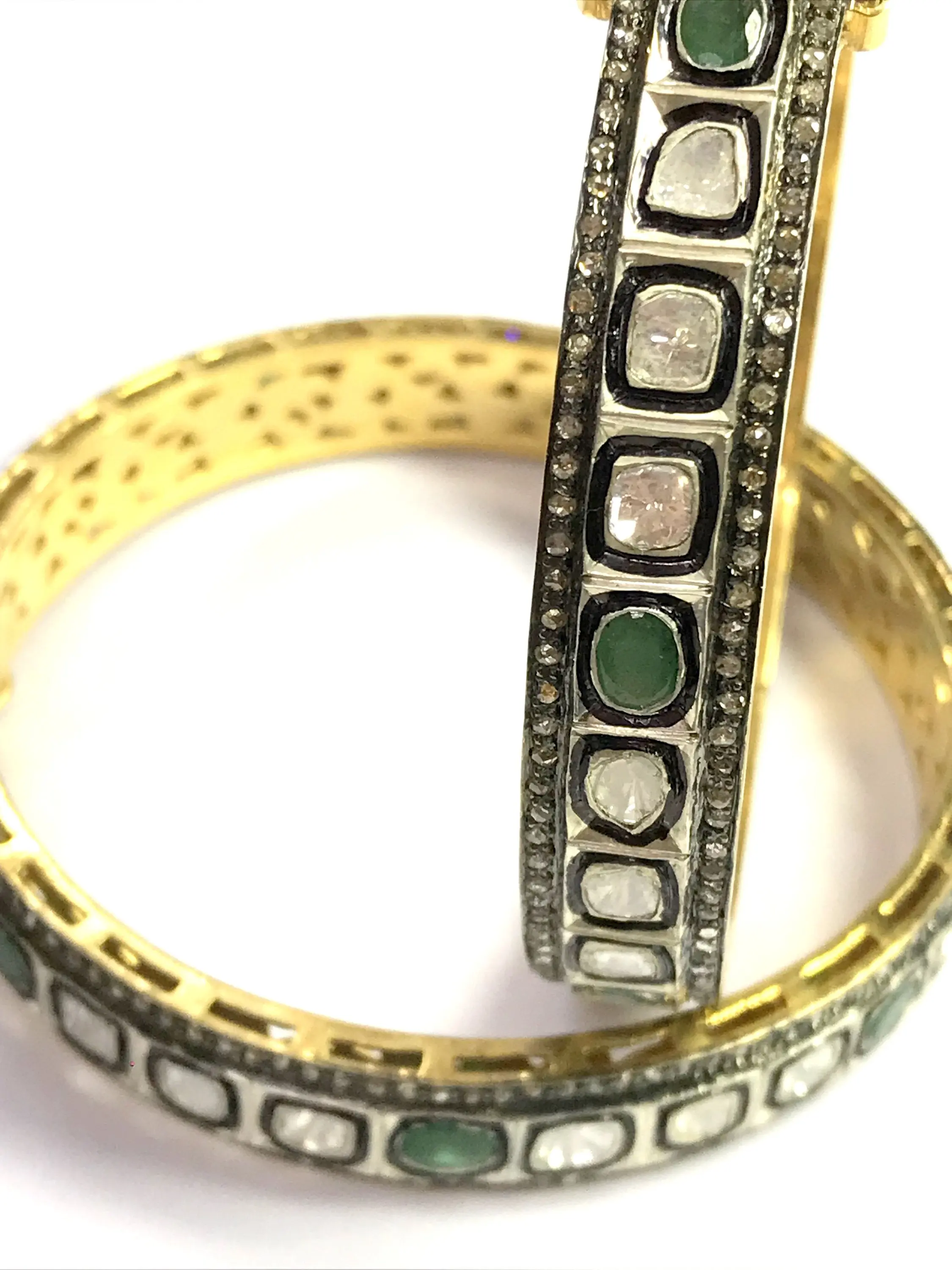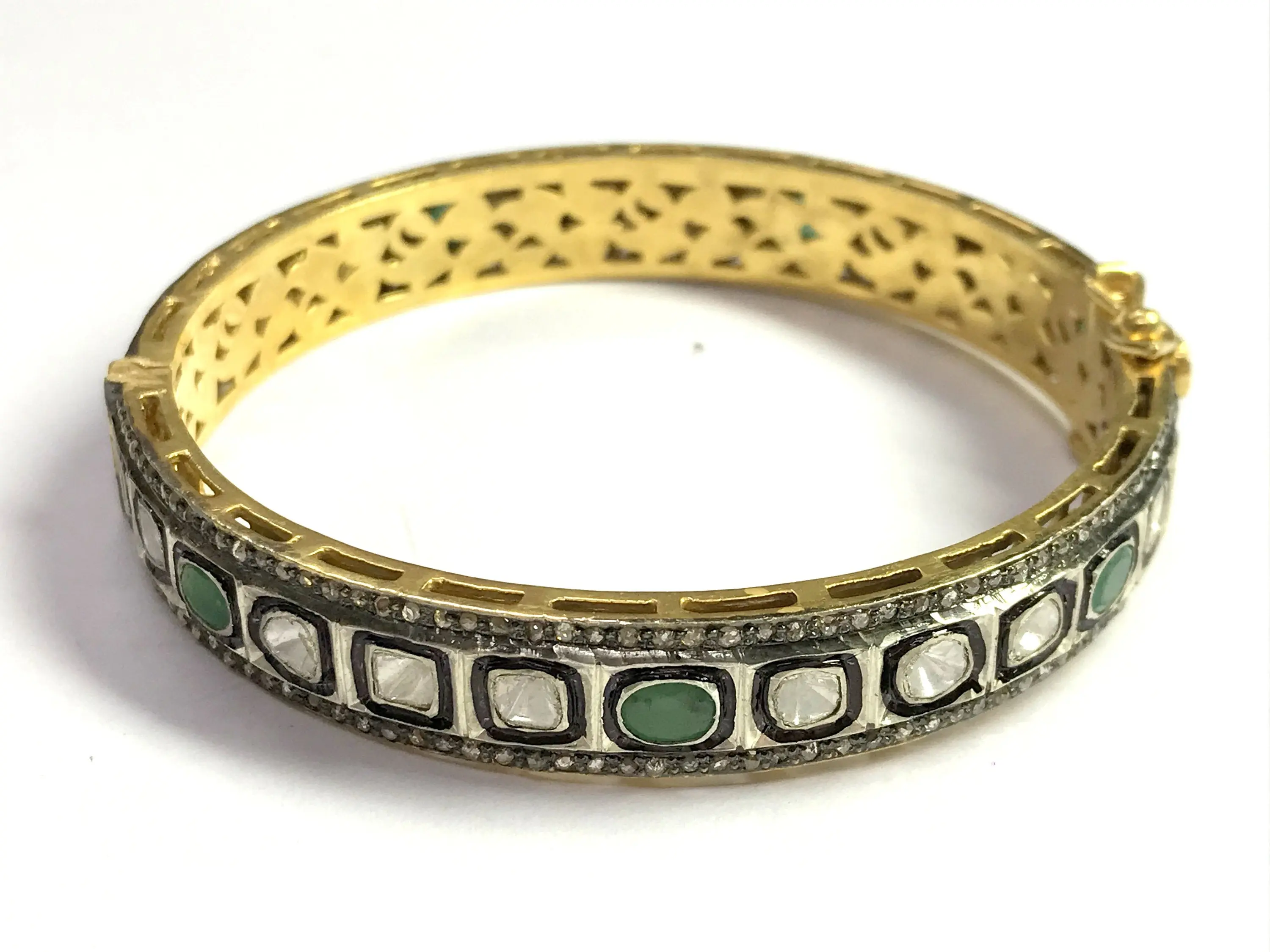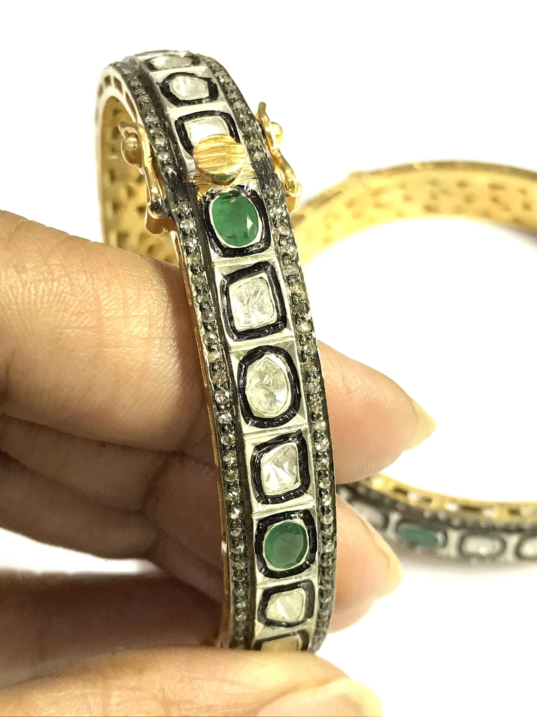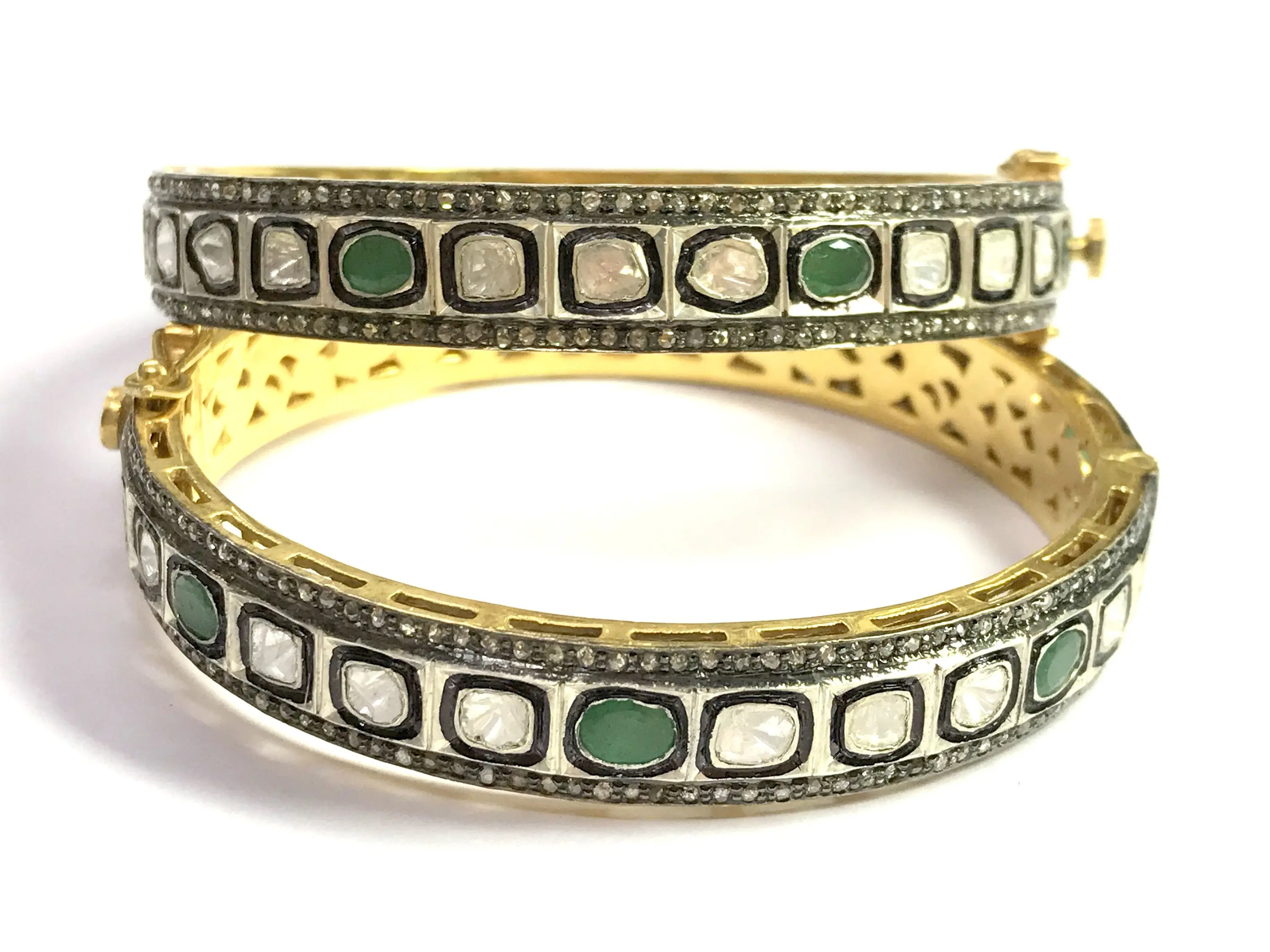ROSE CUT EMERALD DIAMONDS -bezel set Diamond Bangle - 925 Sterling Silver - antique diamonds Bangle -black rhodium plated jewelry, Vintage wedding bangle.....